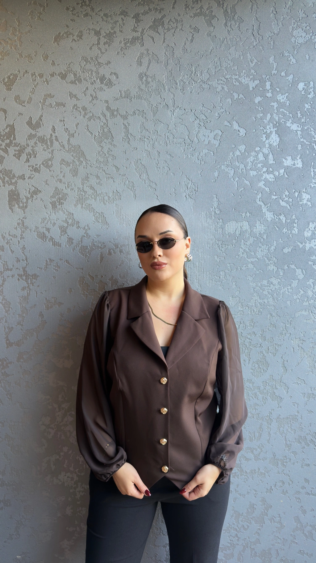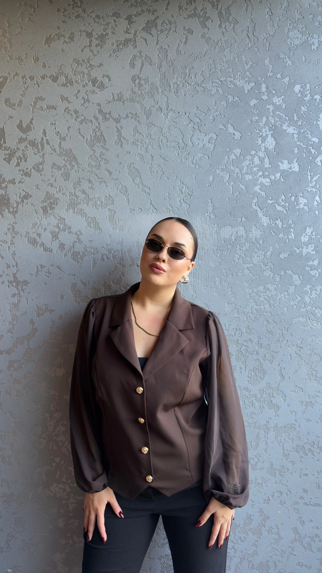 Acı Kahve Kruvaze Yaka Şifon Kollu Bluz