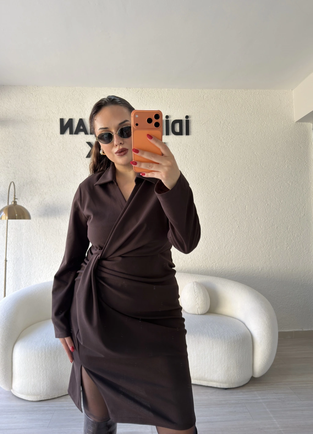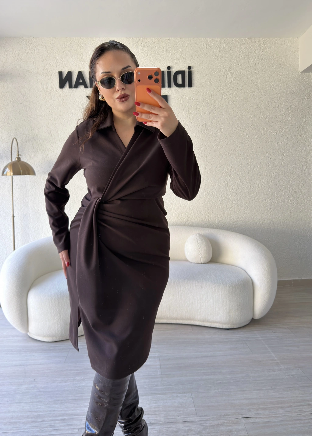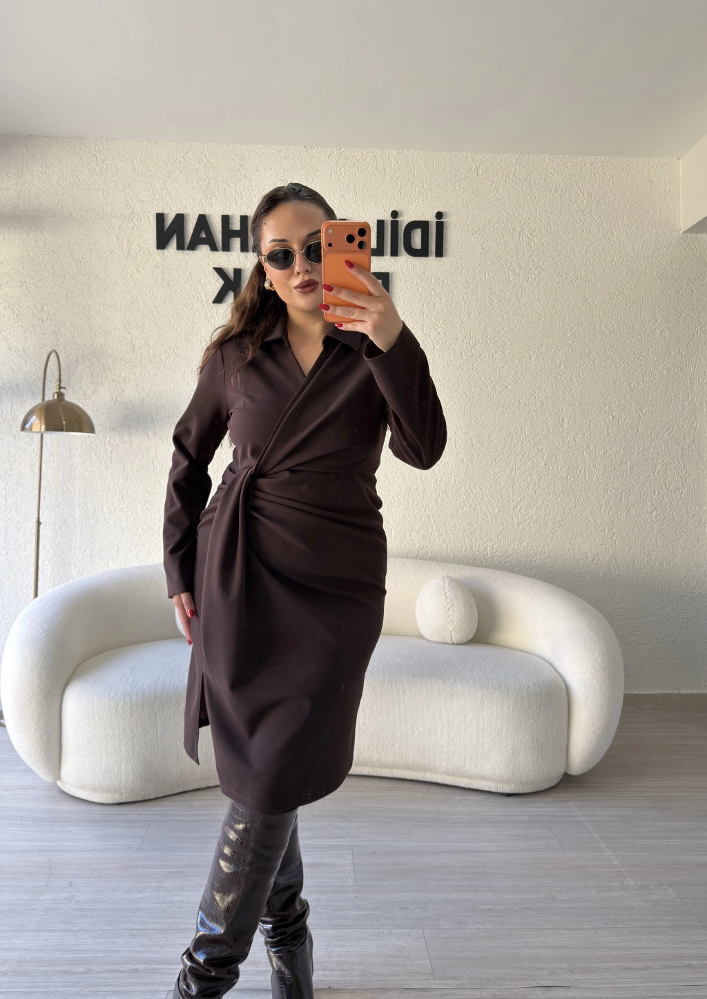 Acı Kahve Kruvaze Pile Detaylı Elbise