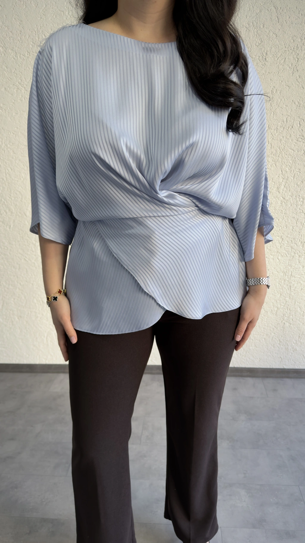 Kahverengi Pembe Puantiyeli Yan Bağcıklı Kruvaze Bluz