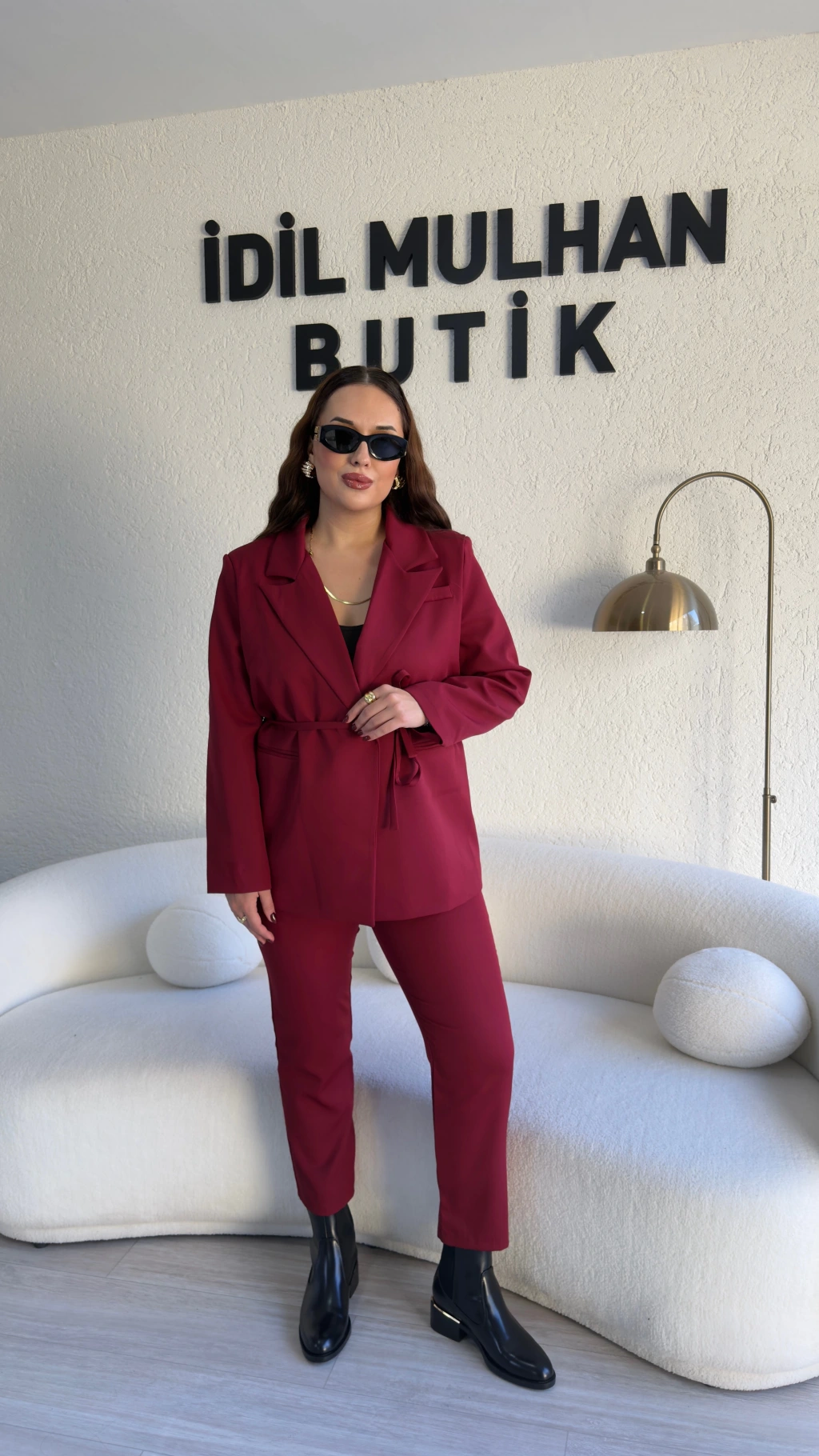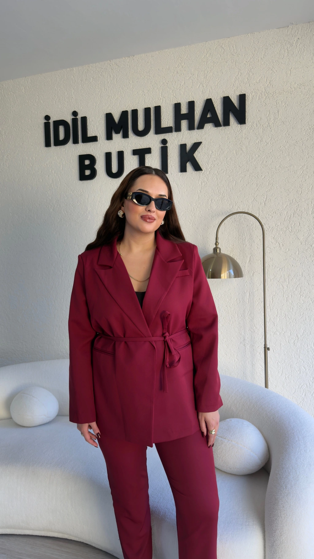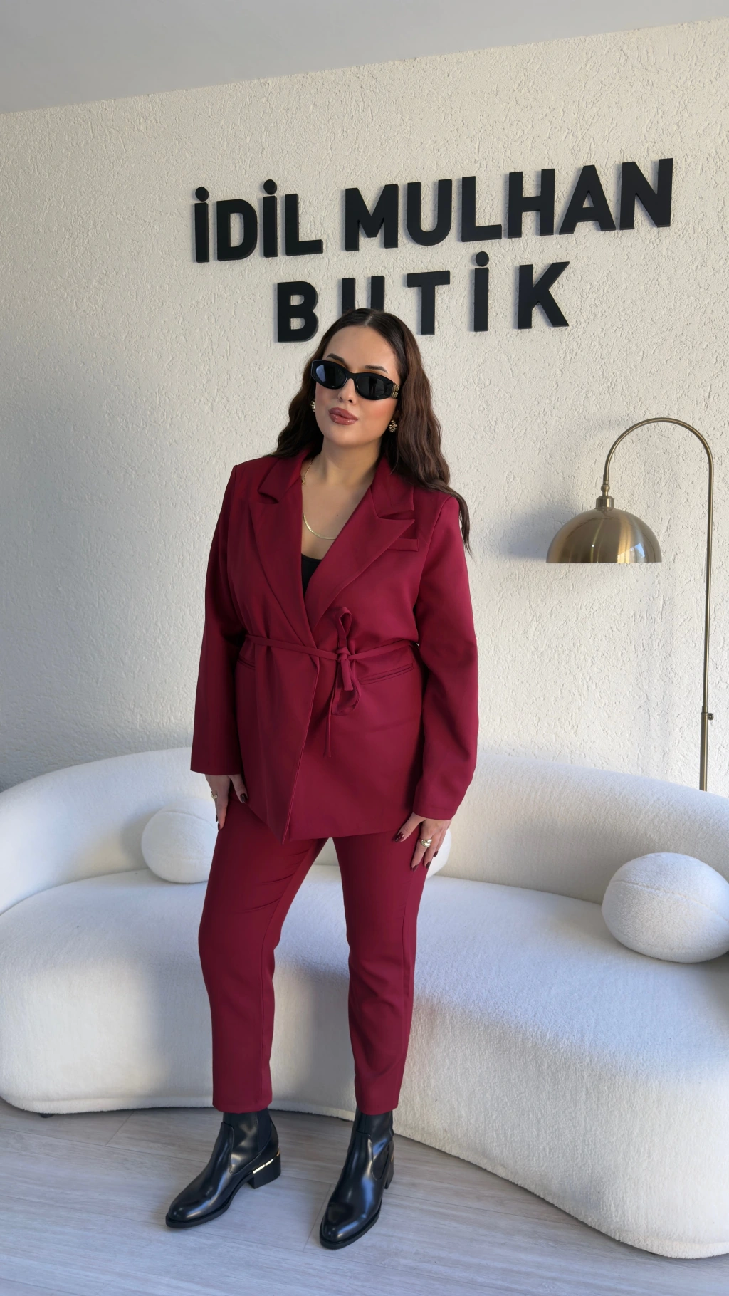 Bordo Bağlama Detaylı Kruvaze Blazer Takım