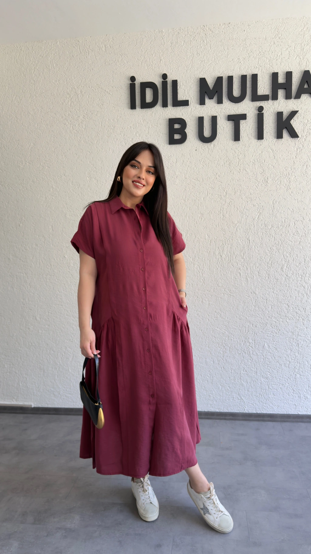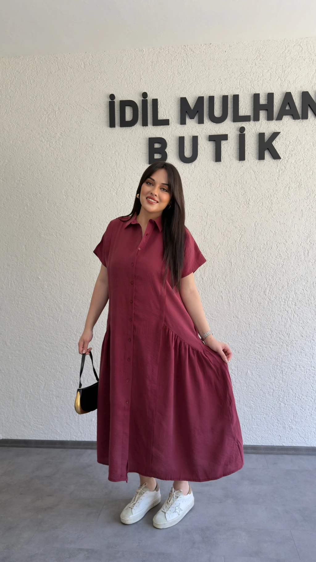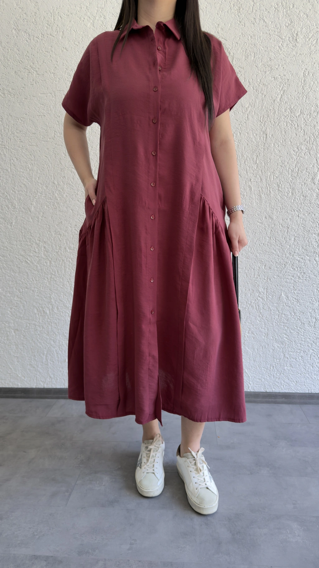 Kahverengi Etek Büzgülü Düğmeli Elbise