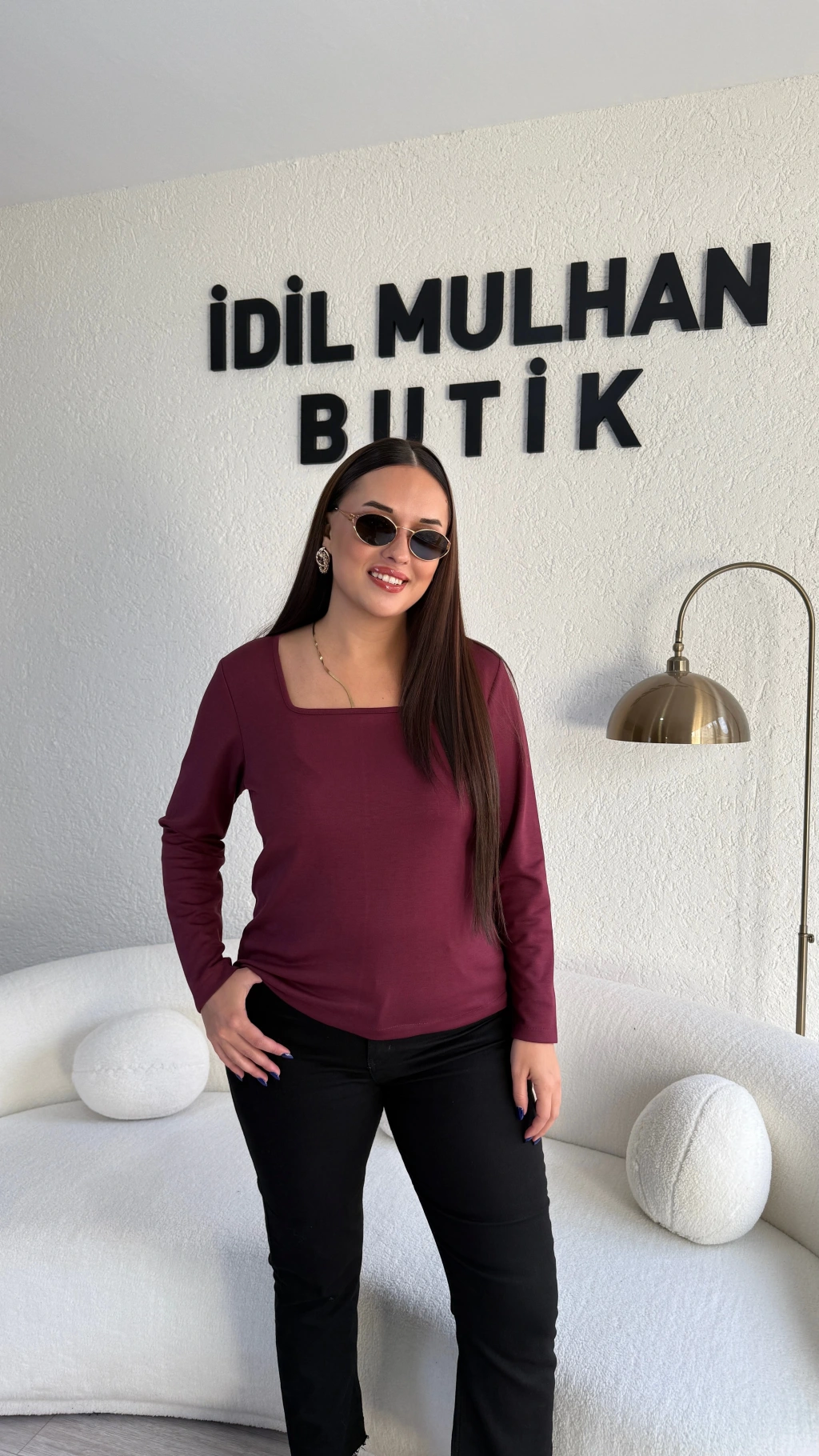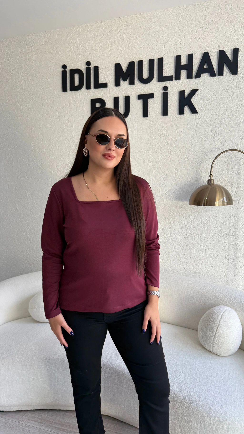 Bordo Kare Yaka Oysh Kumaş Bluz