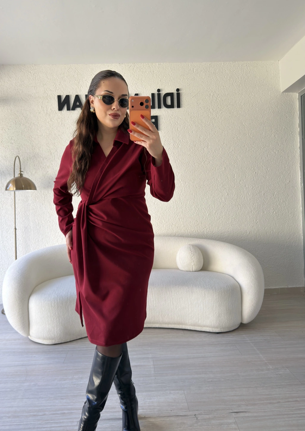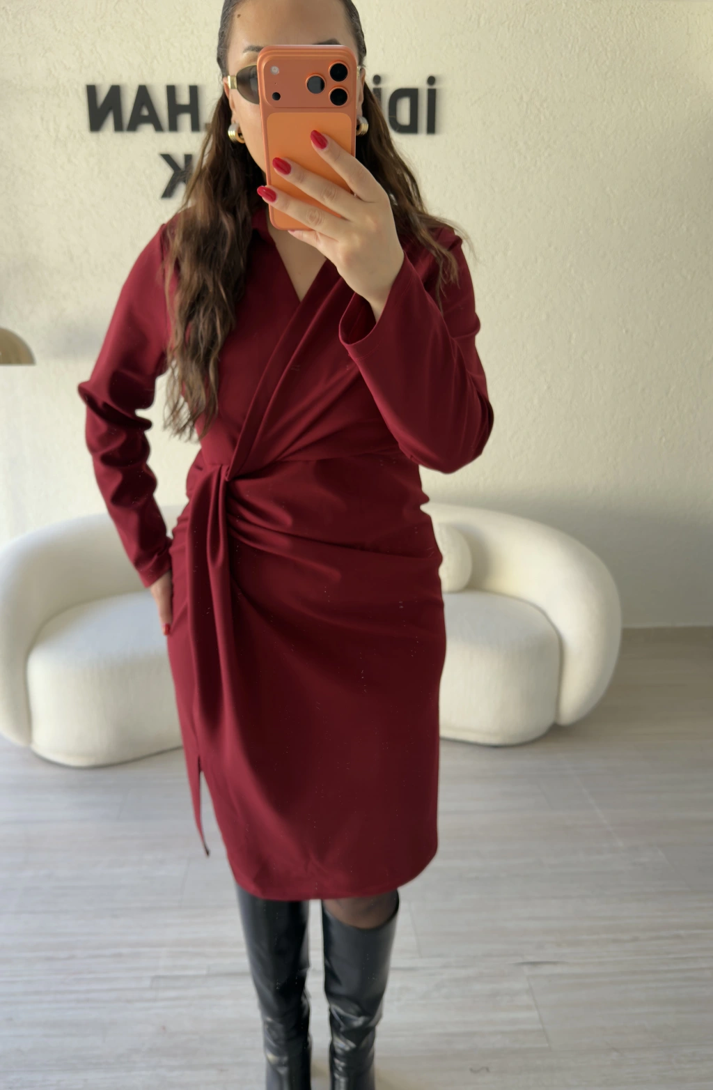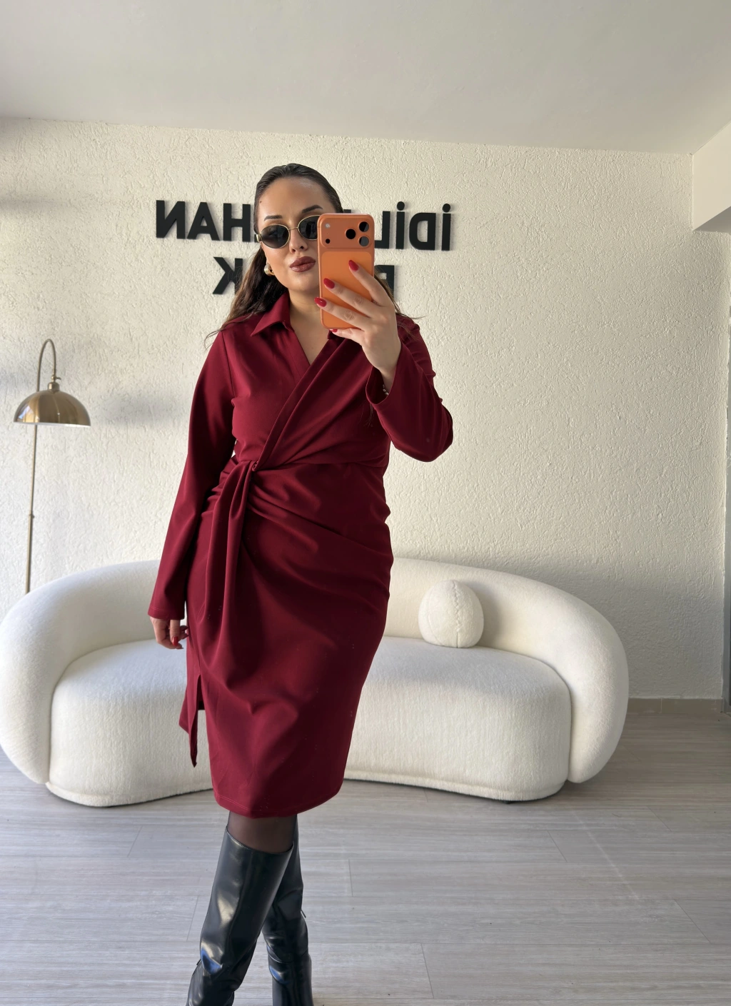 Kırmızı Krep Kumaş Düğüm Detaylı Elbise
