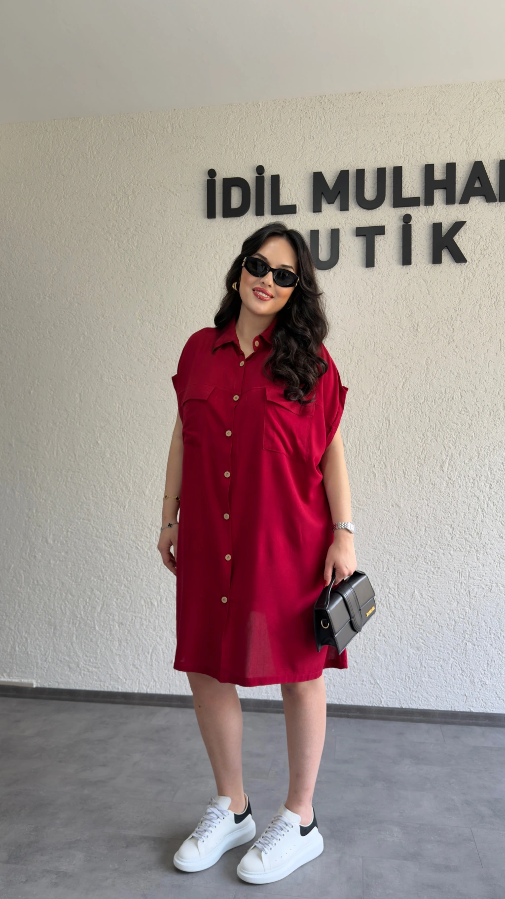 Bordo Kuşak Detaylı Gömlek Elbise