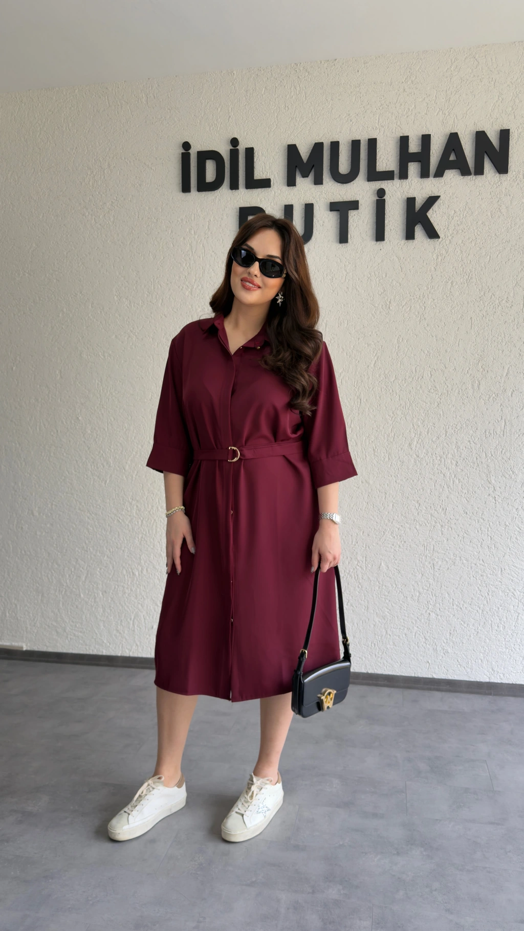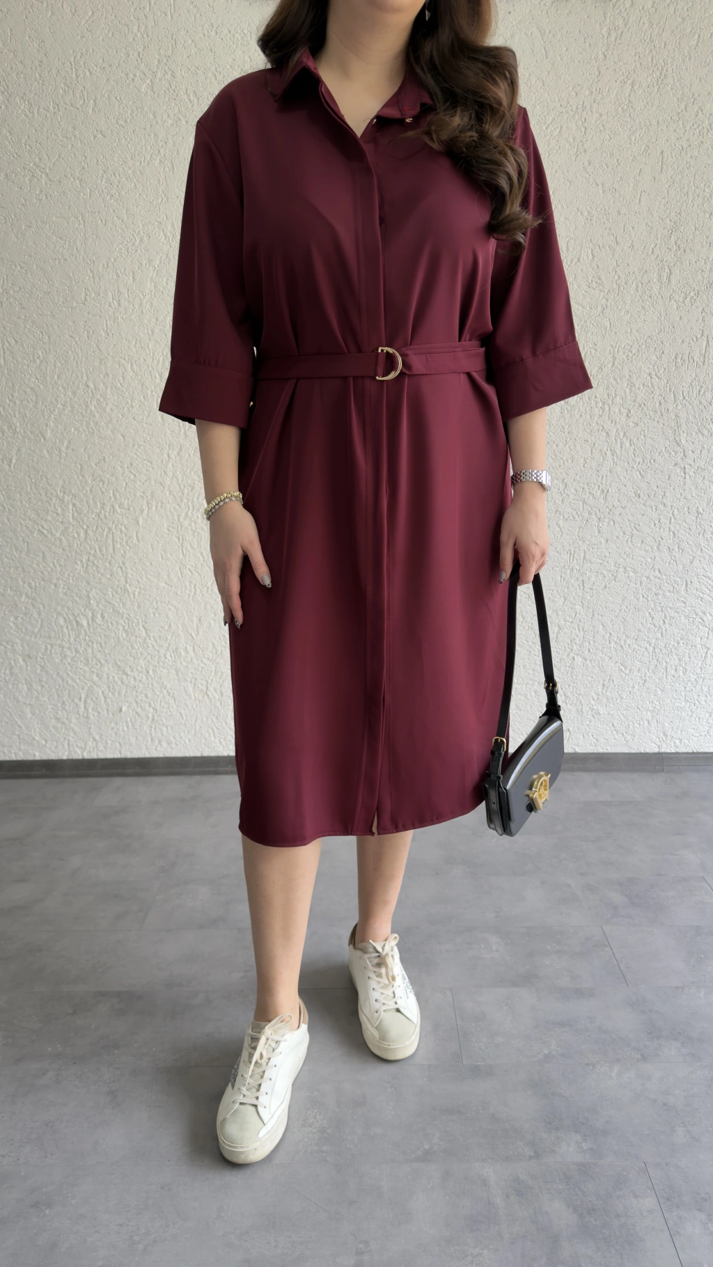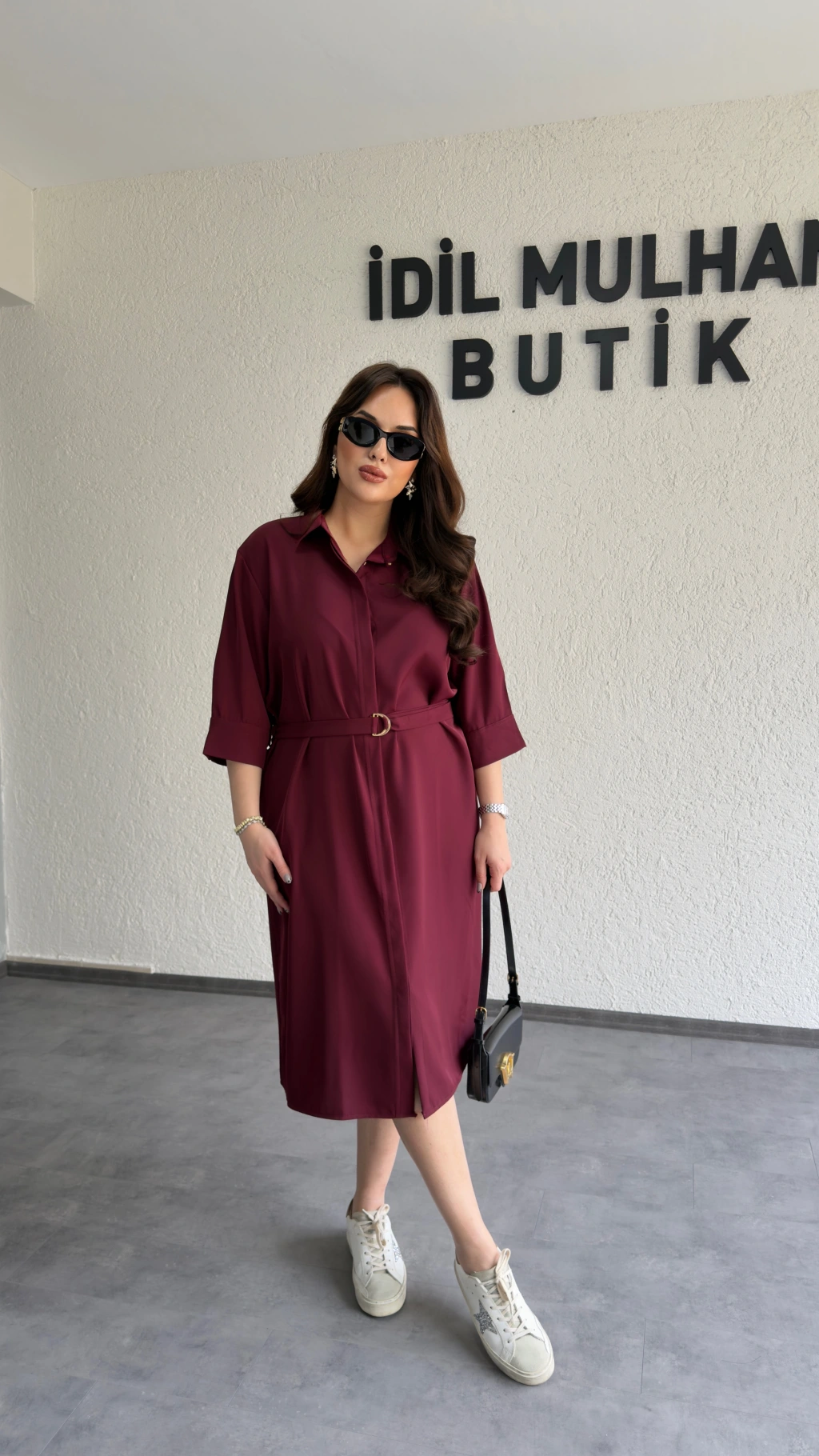 Bordo Kuşaklı Premium Gömlek Elbise