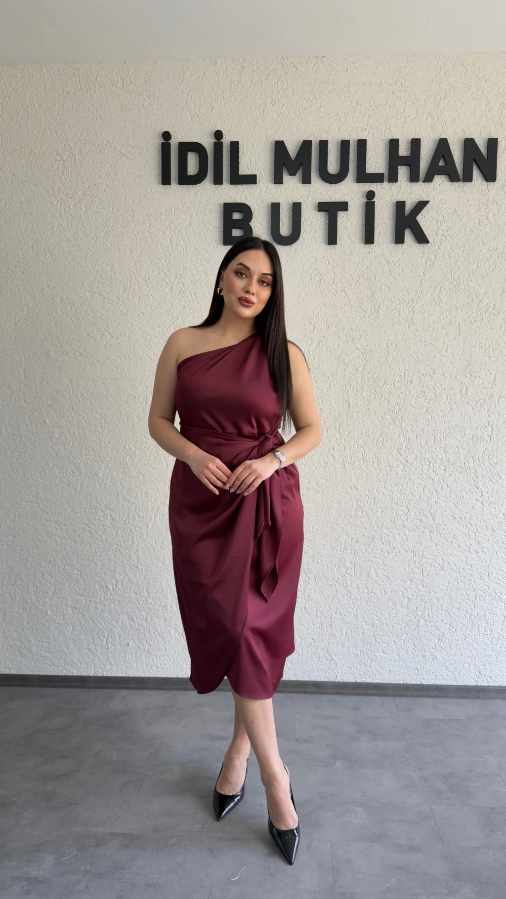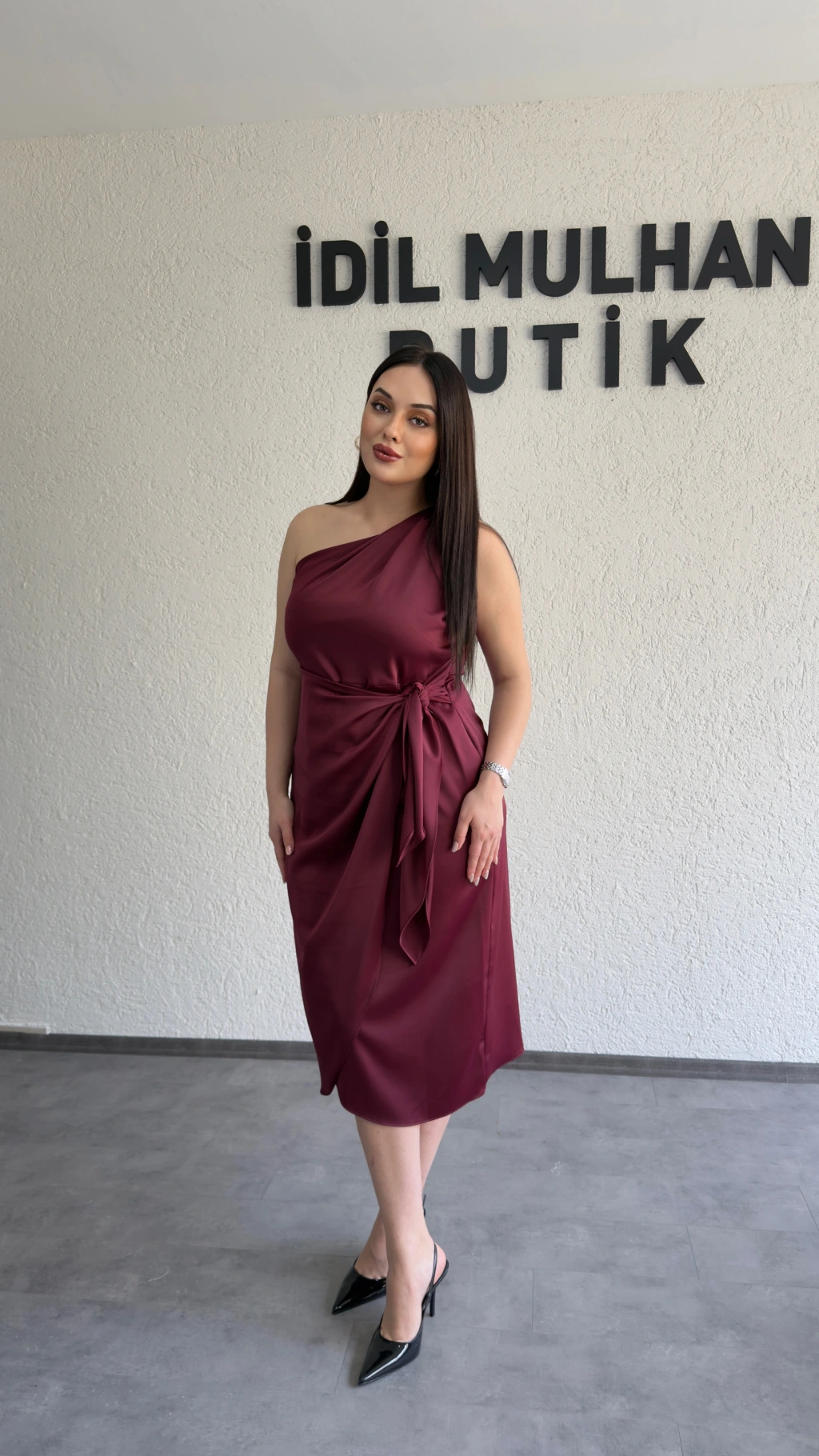 Bordo Tek Omuz Bağlama Detaylı Saten Elbise