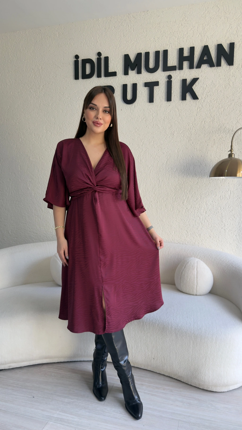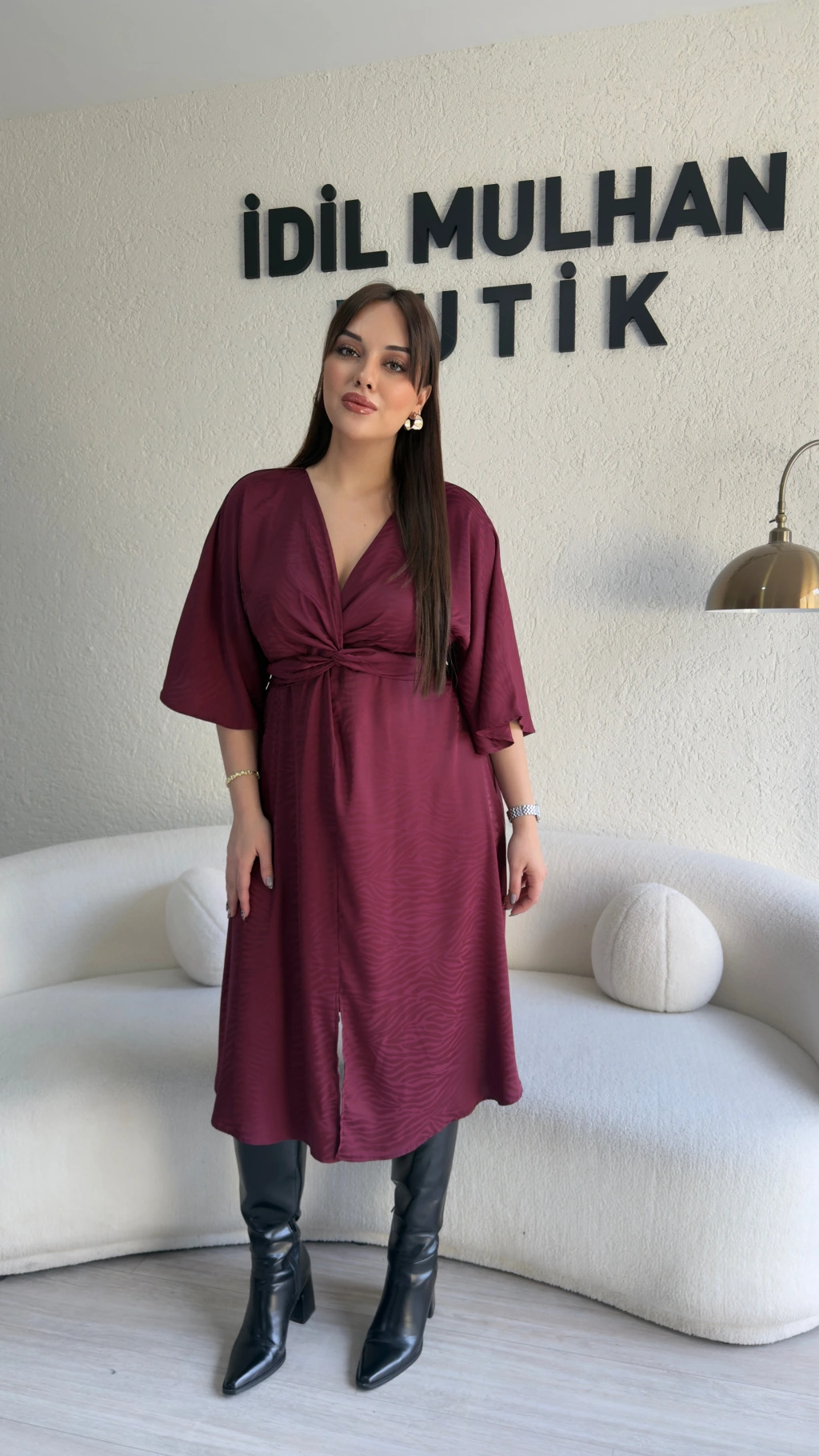 Bordo Yarasa Kol Saten Elbise
