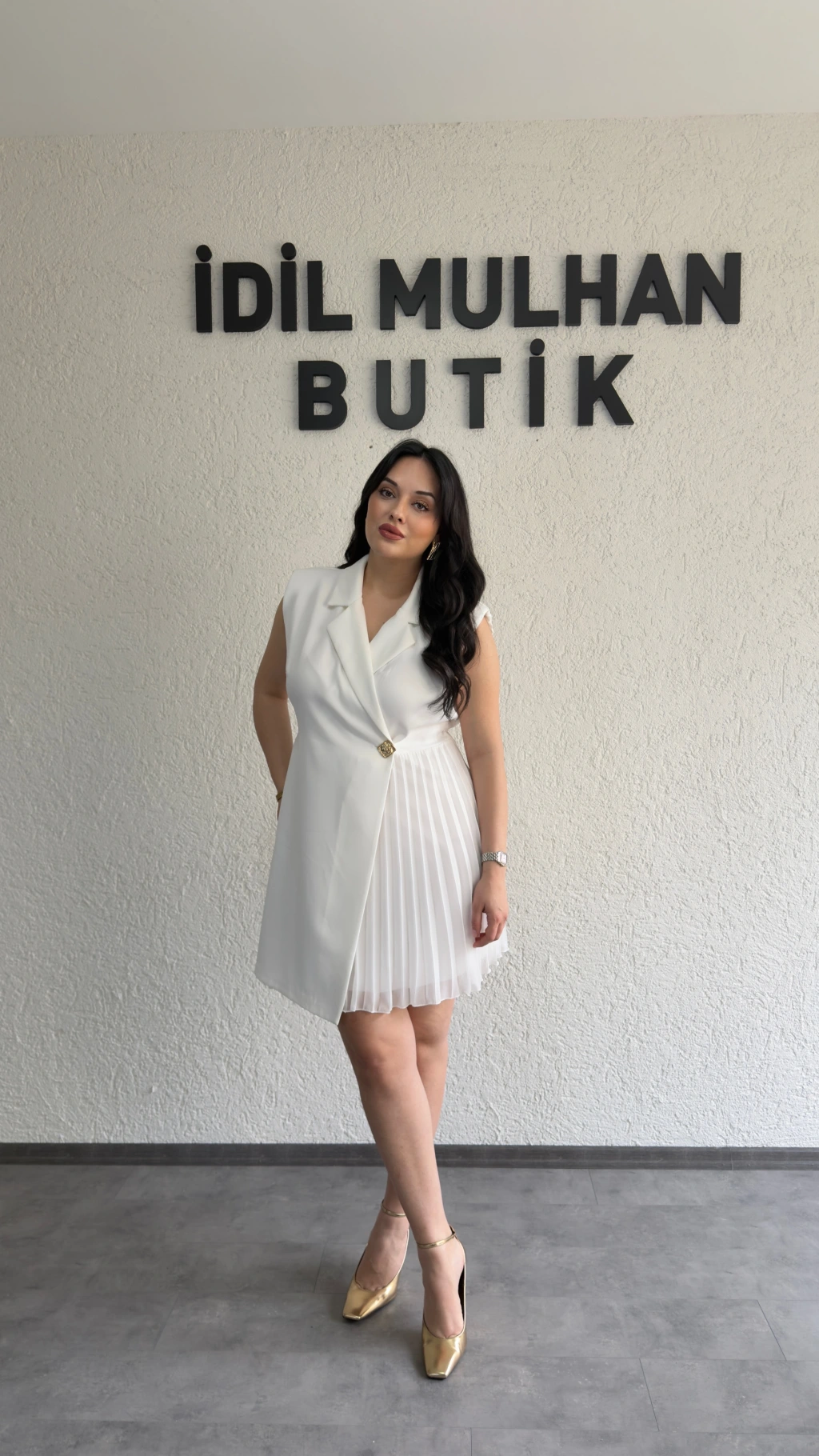 Ekru Kruvaze Yaka Gold Düğme Detaylı Abiye