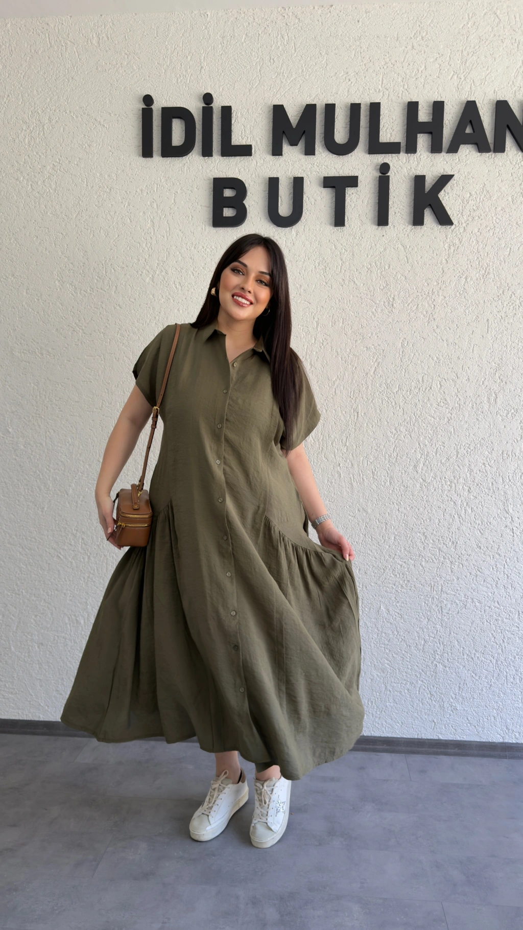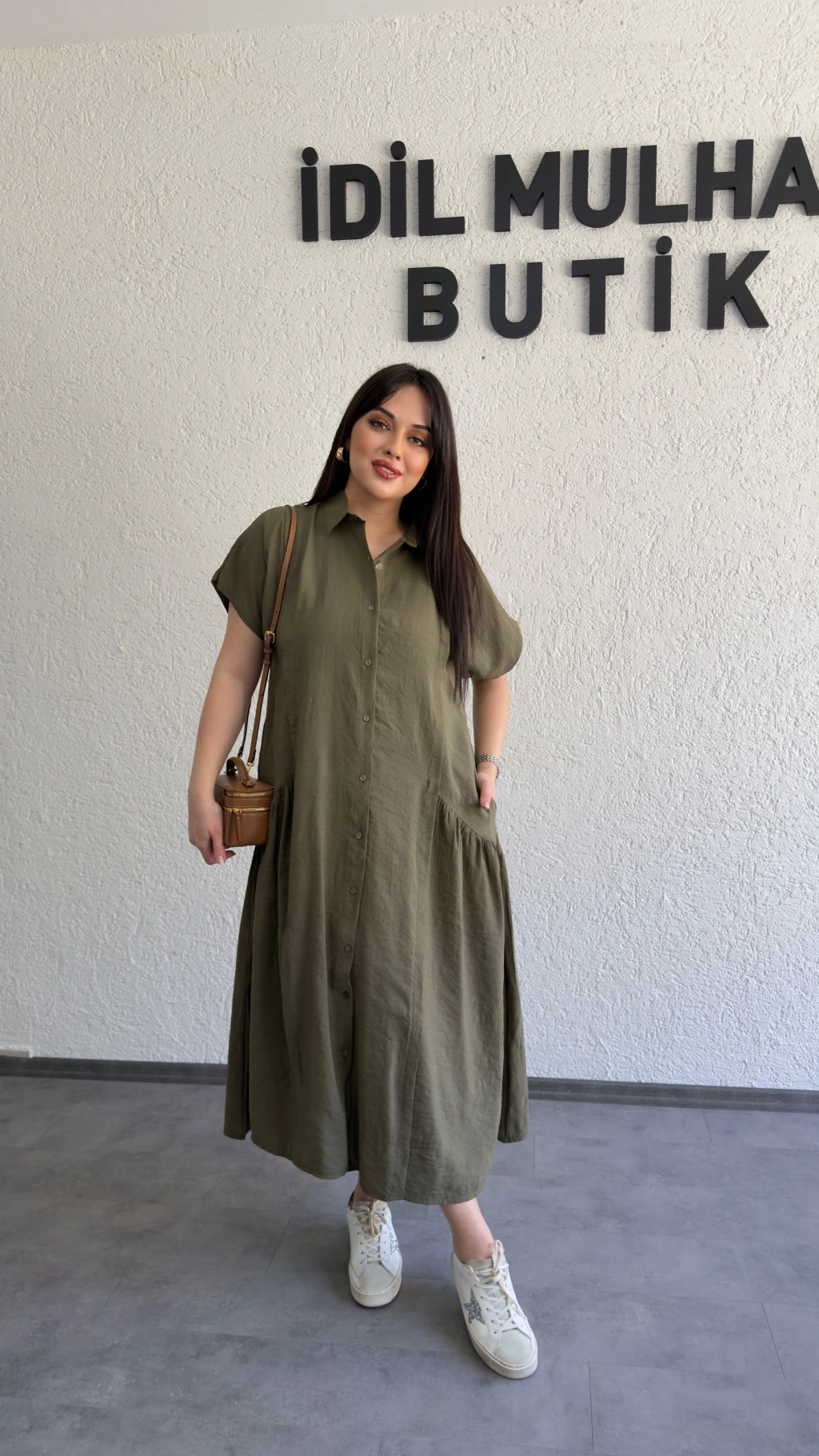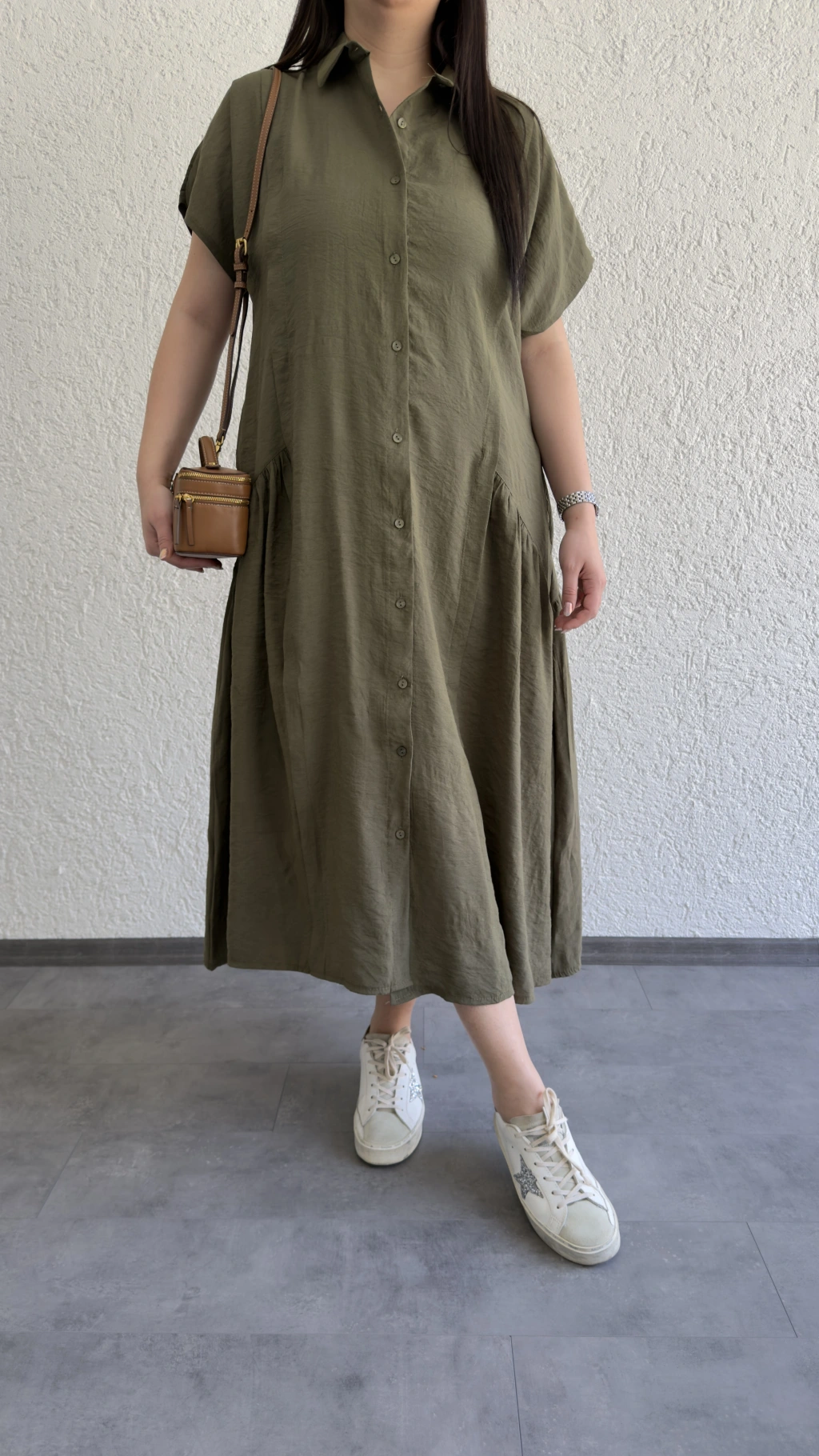 Haki Etek Büzgülü Düğmeli Elbise