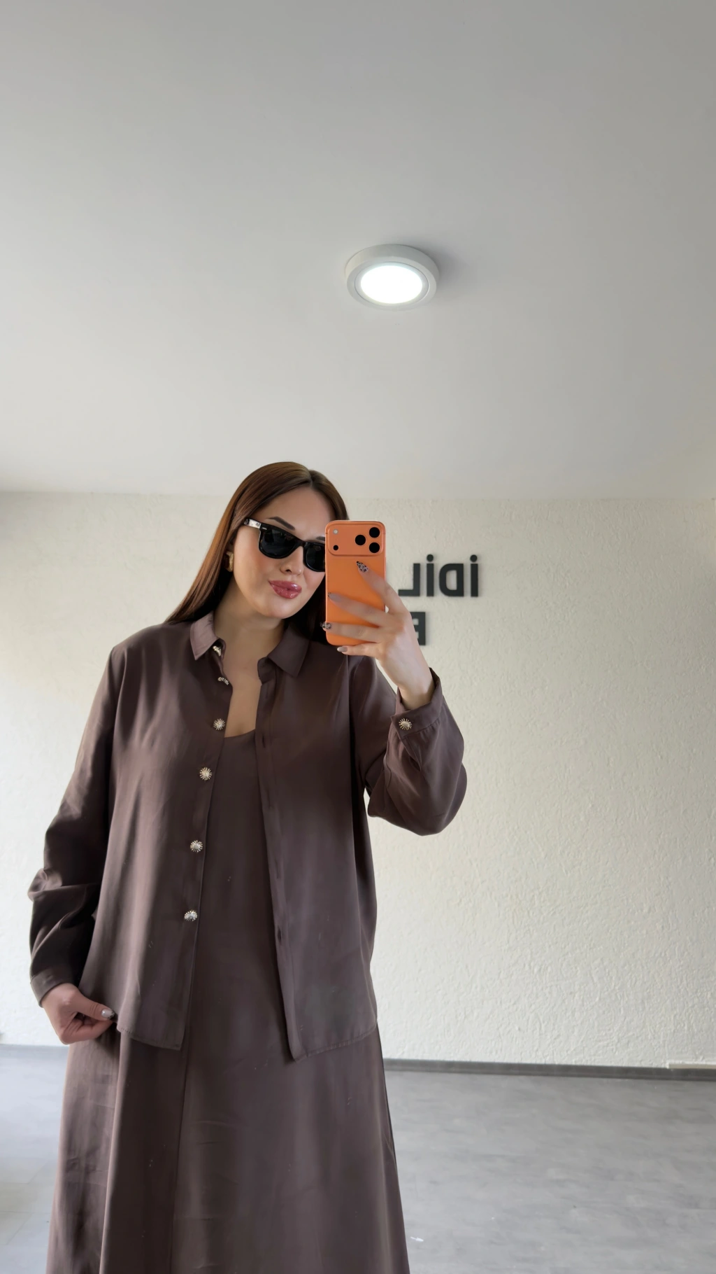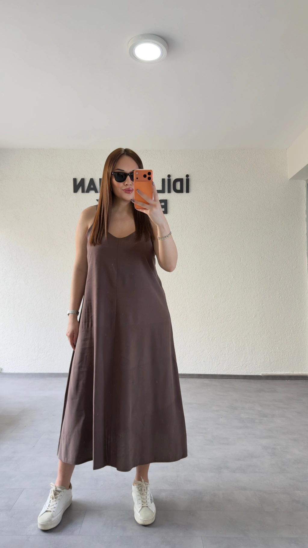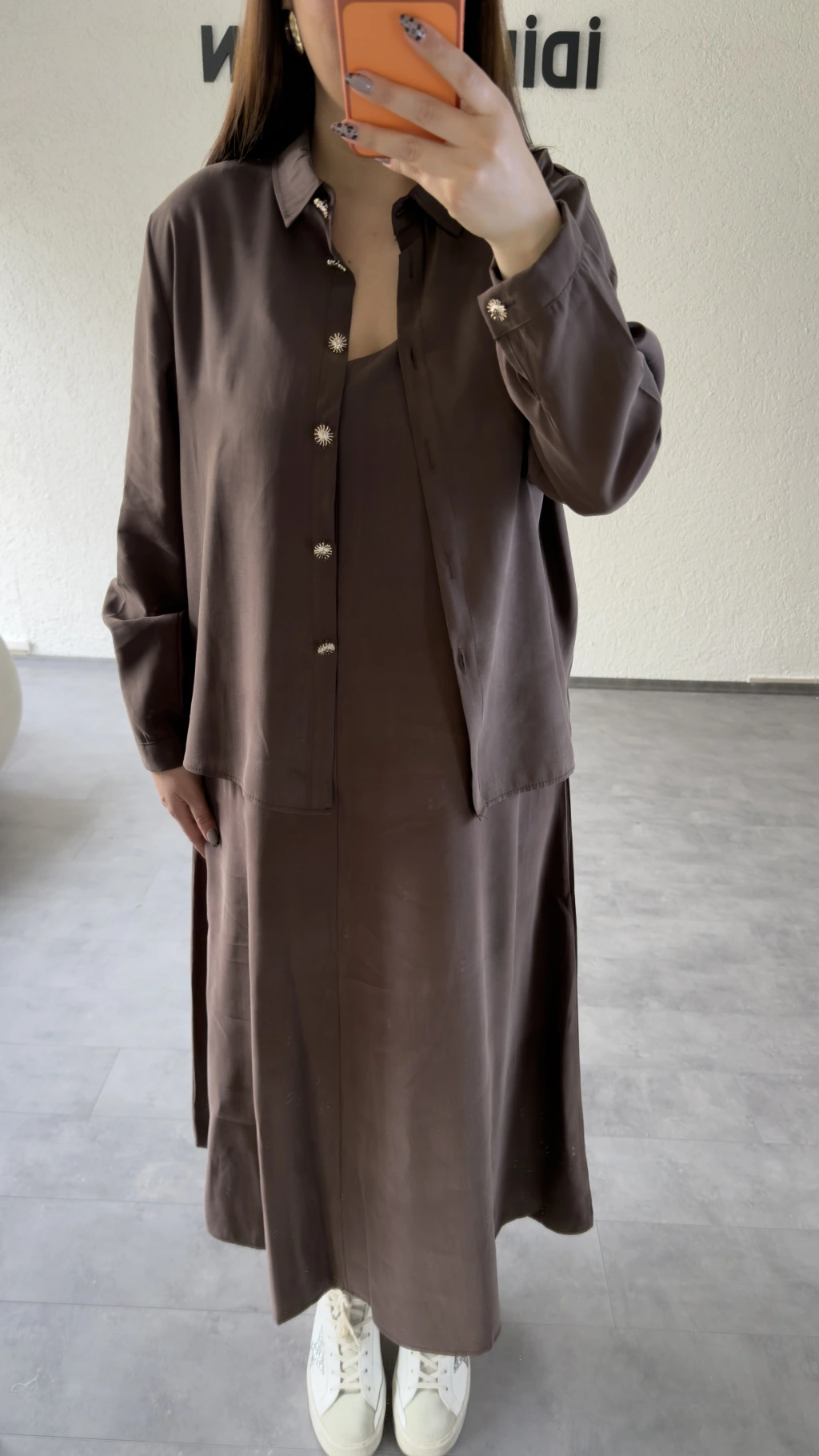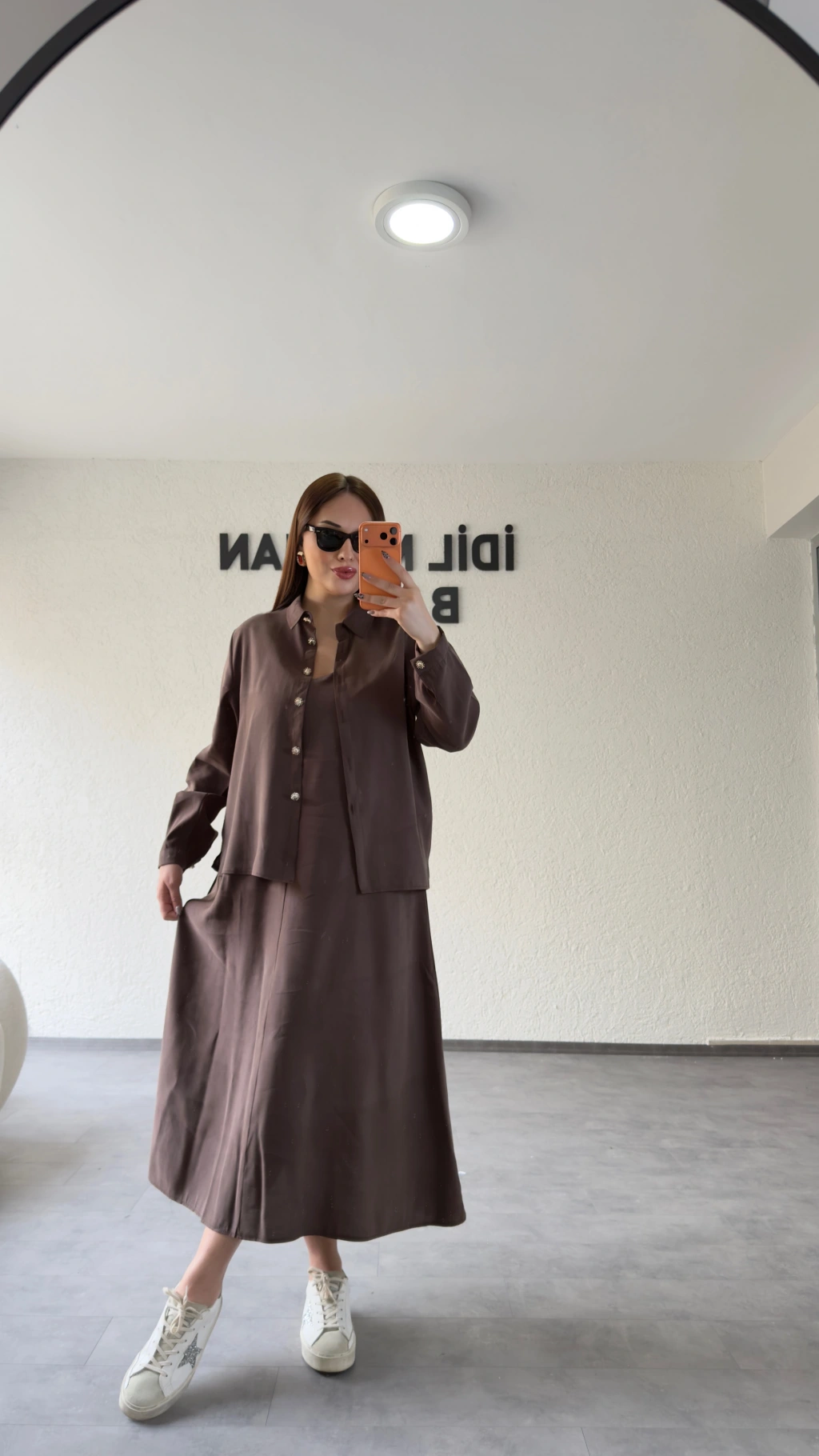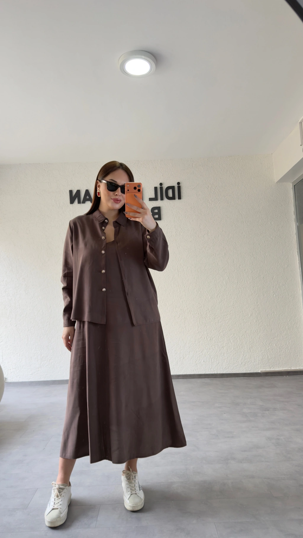 Kahverengi Askılı Elbise Çıkarılabilir Gömlek Detaylı Takım