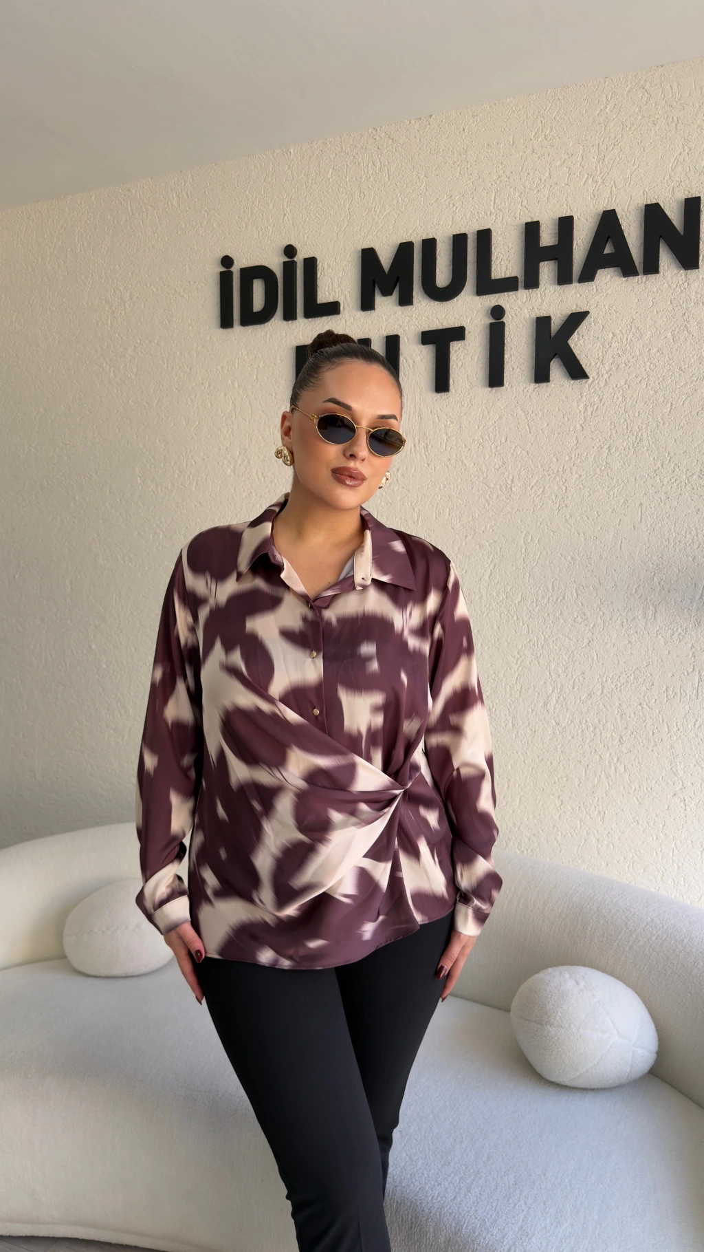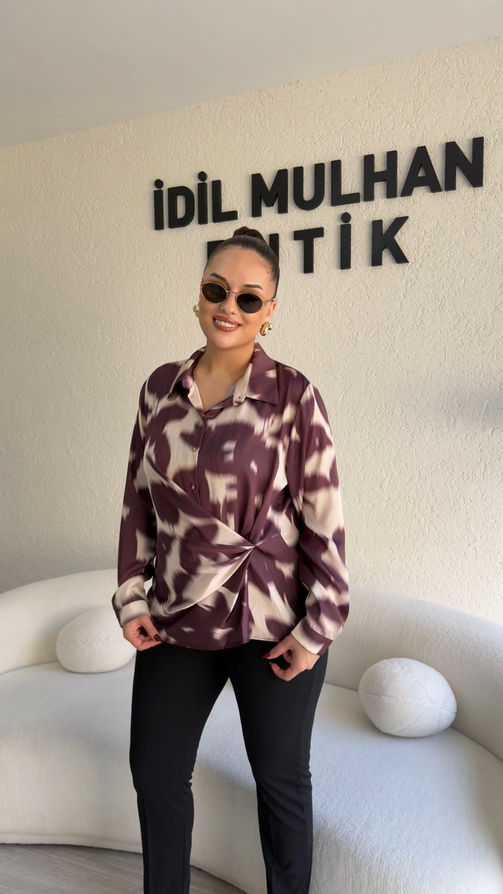 Kahverengi Bağlama Detaylı Batik Desenli Bluz