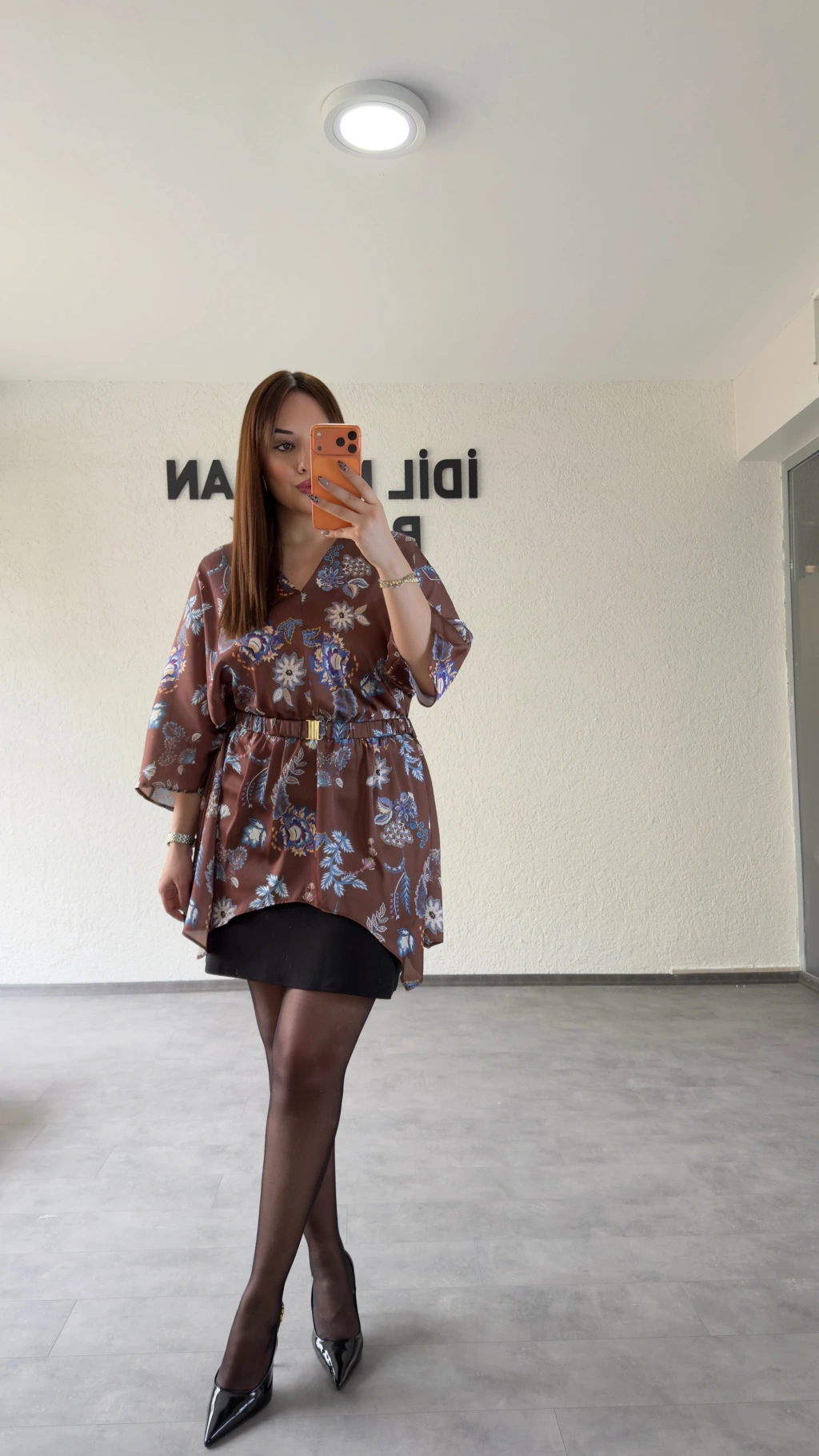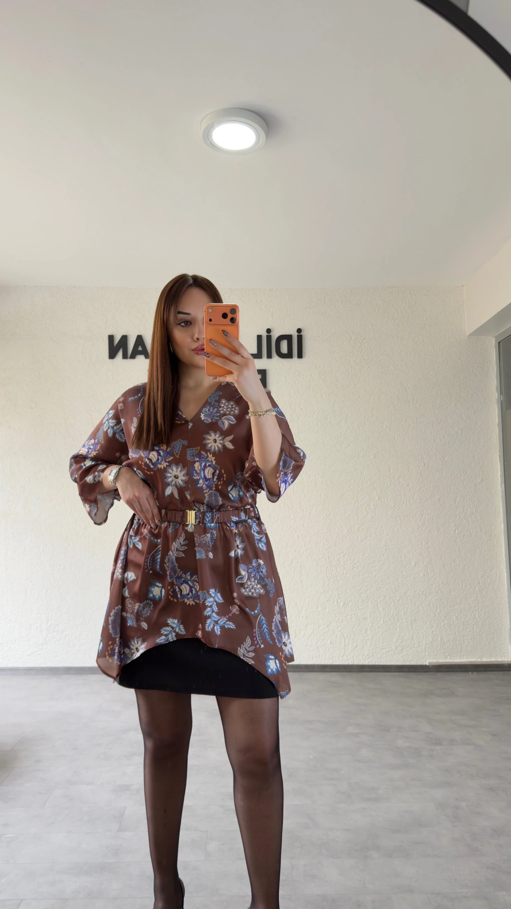 Kahverengi Çiçek Desenli Kemer Detaylı Dökümlü Bluz