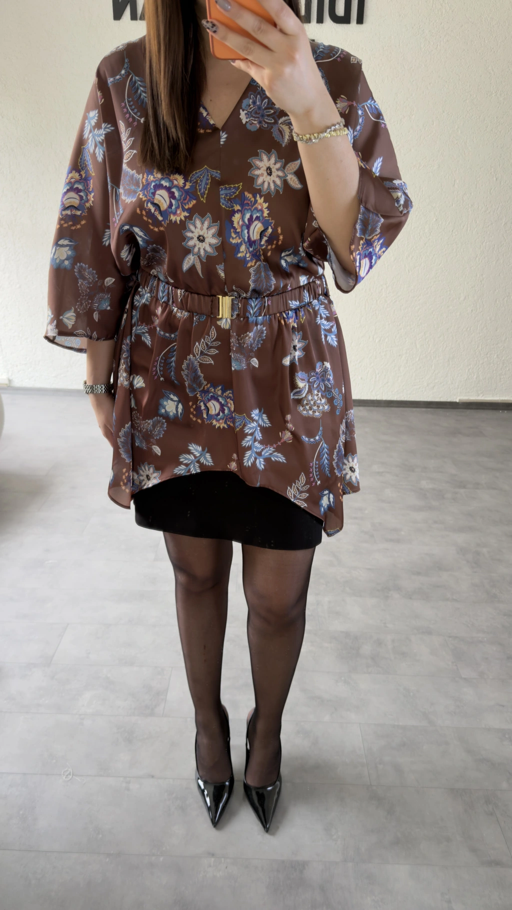 Siyah Çiçek Desenli Kemer Detaylı Dökümlü Bluz