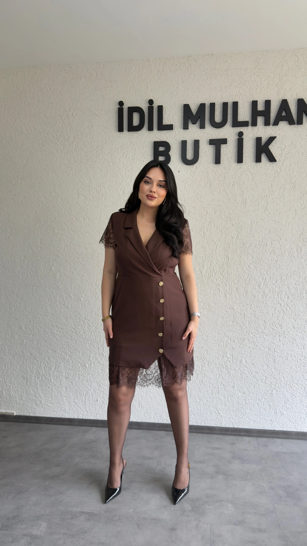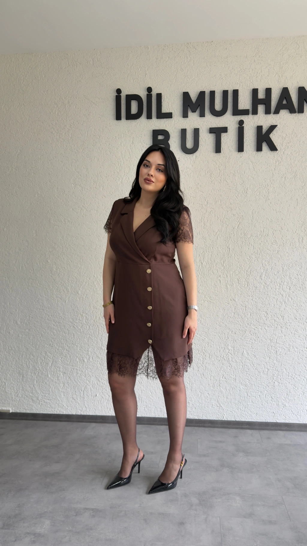 Kahverengi Dantel Detaylı Kruvaze Blazer Elbise
