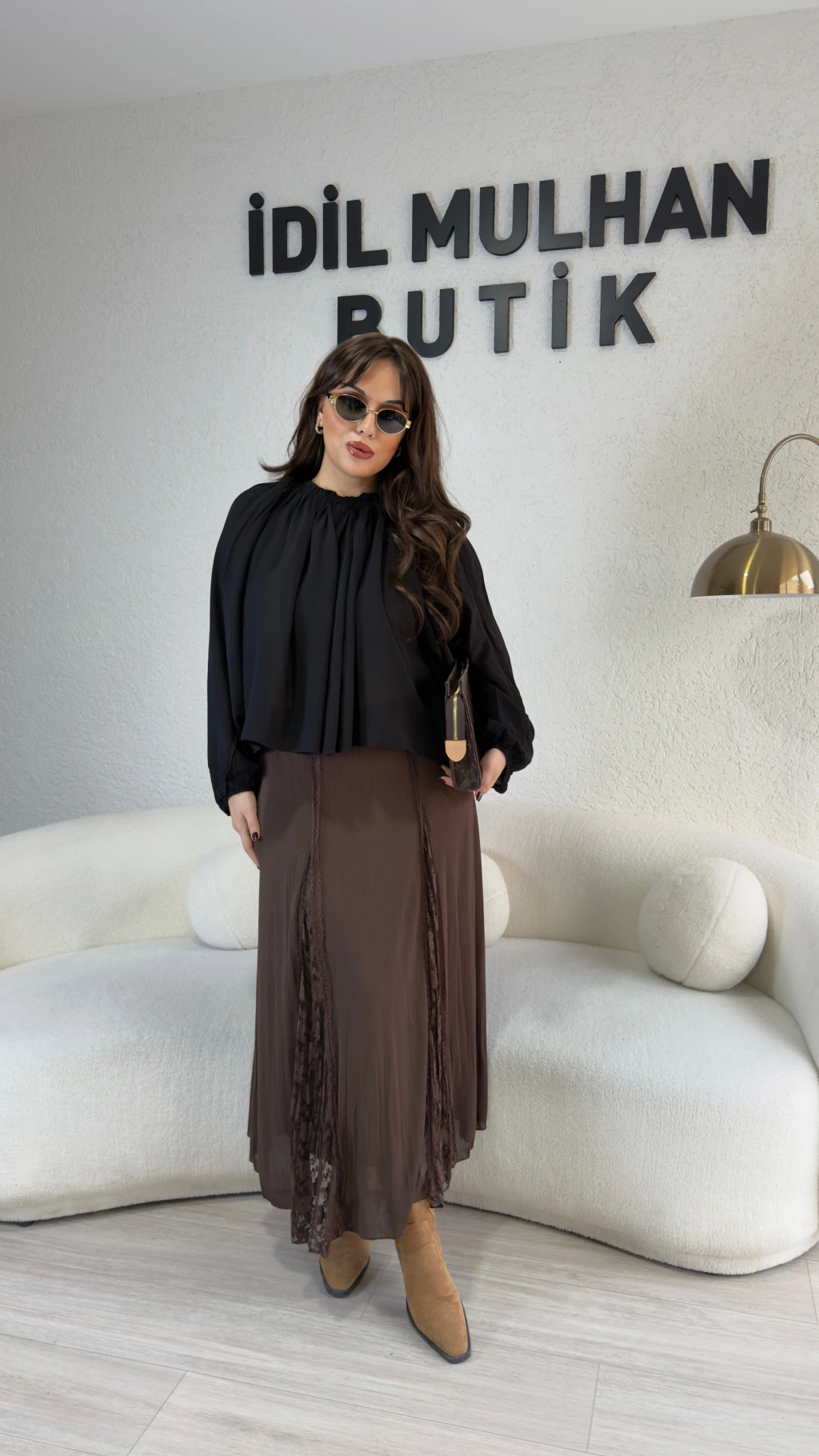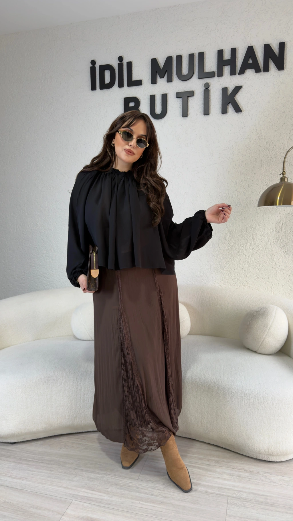 Kahverengi Dökümlü Piliseli Midi Elbise