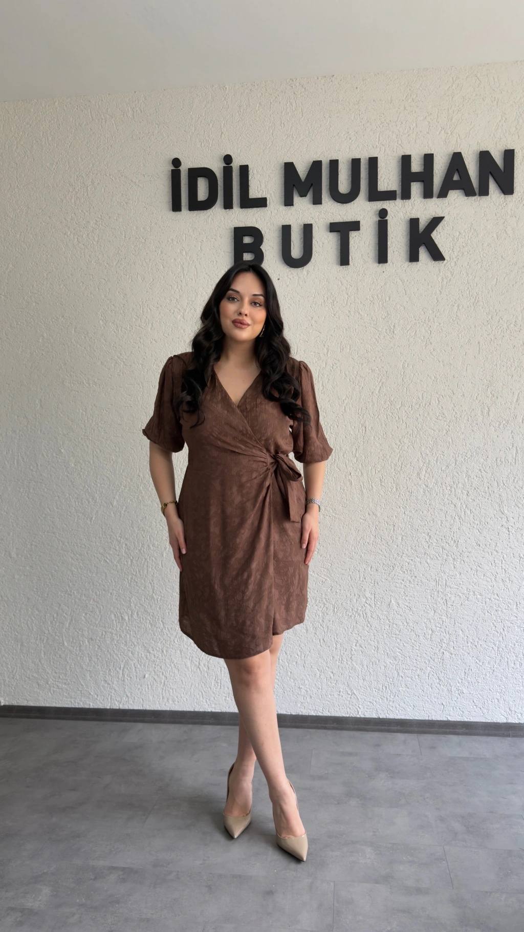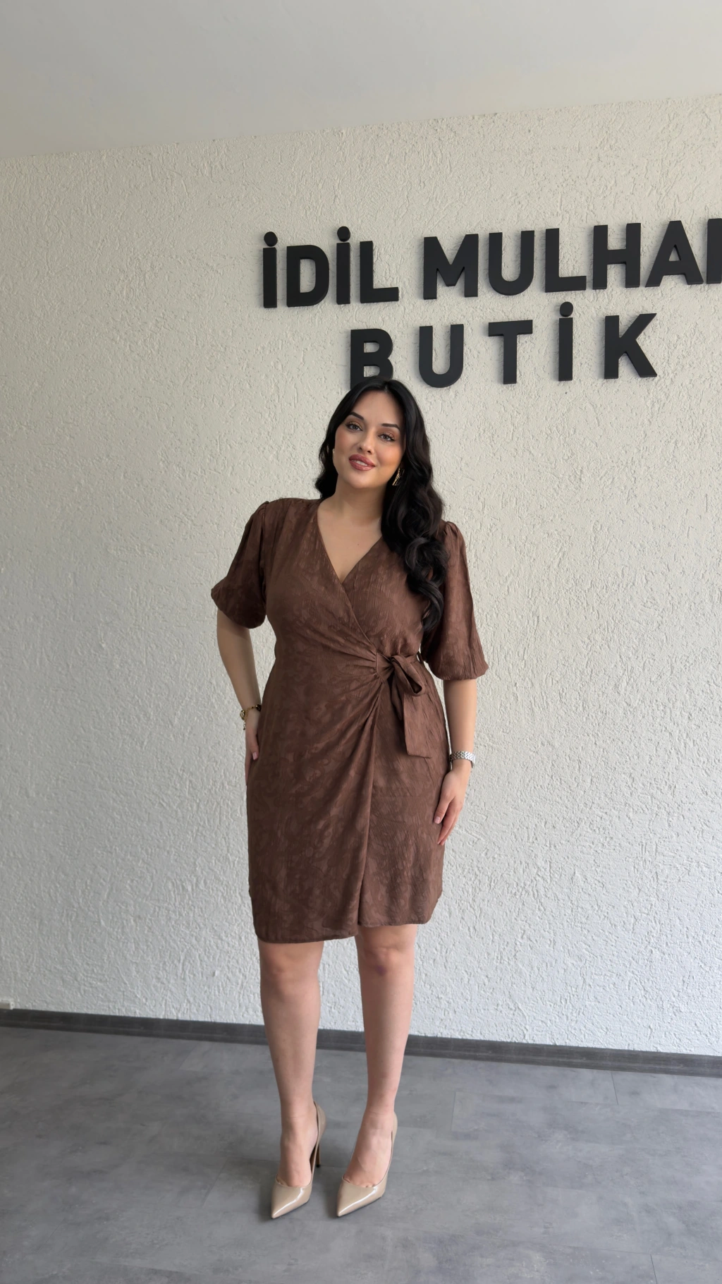 Kahverengi Jakarlı Kruvaze Yaka Bağlamalı Elbise