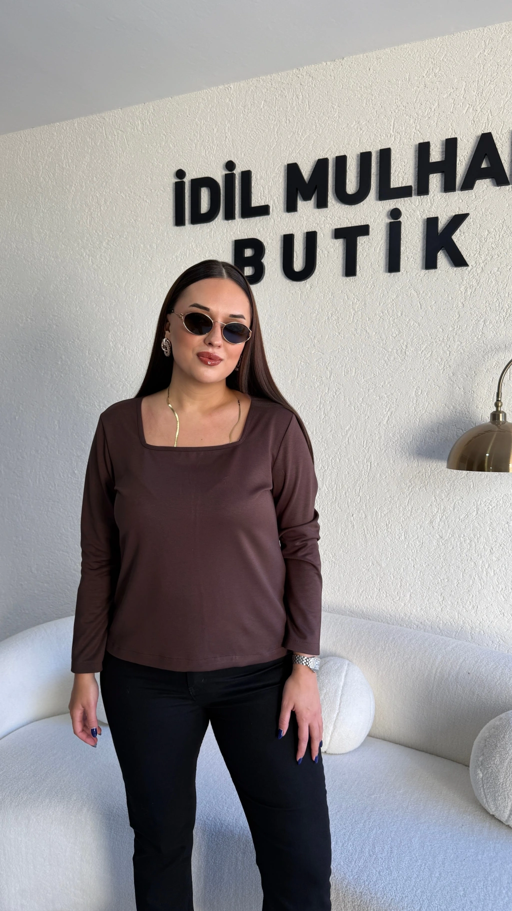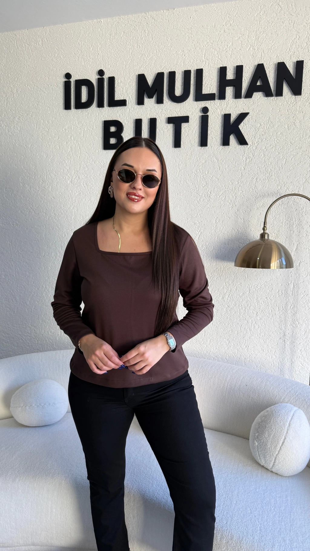Kahverengi Kare Yaka Oysh Kumaş Bluz