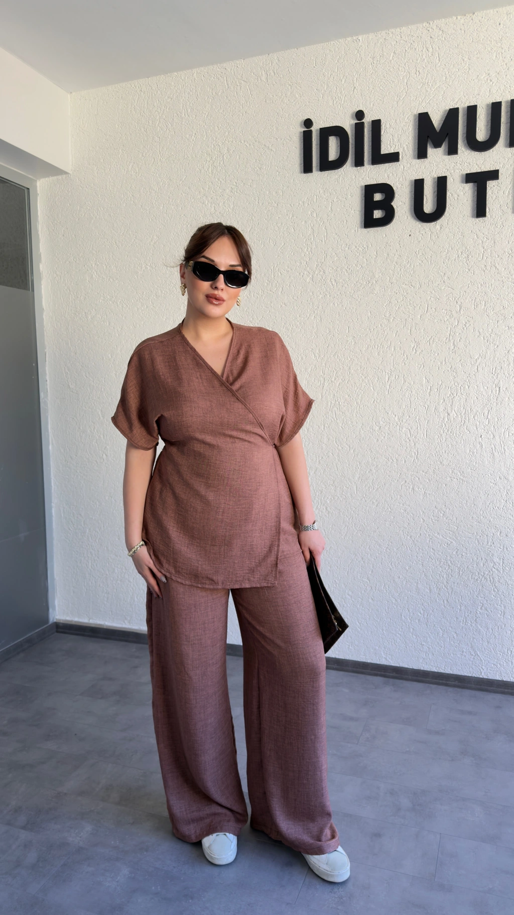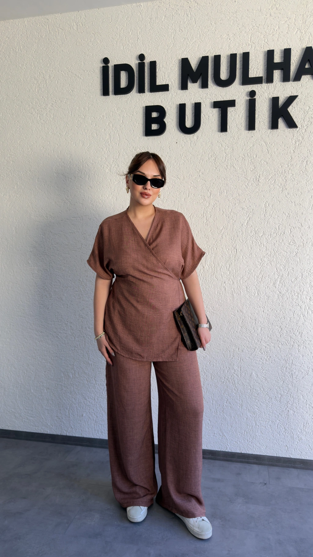 Kahverengi Kruvaze Bluz Pantolon Takım