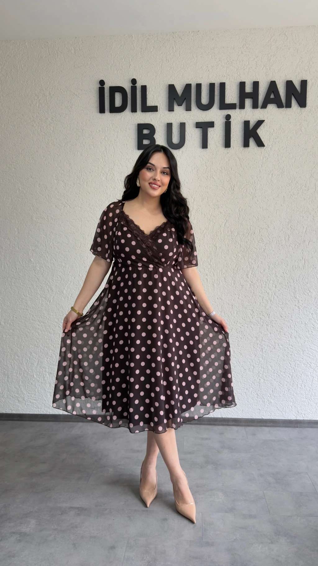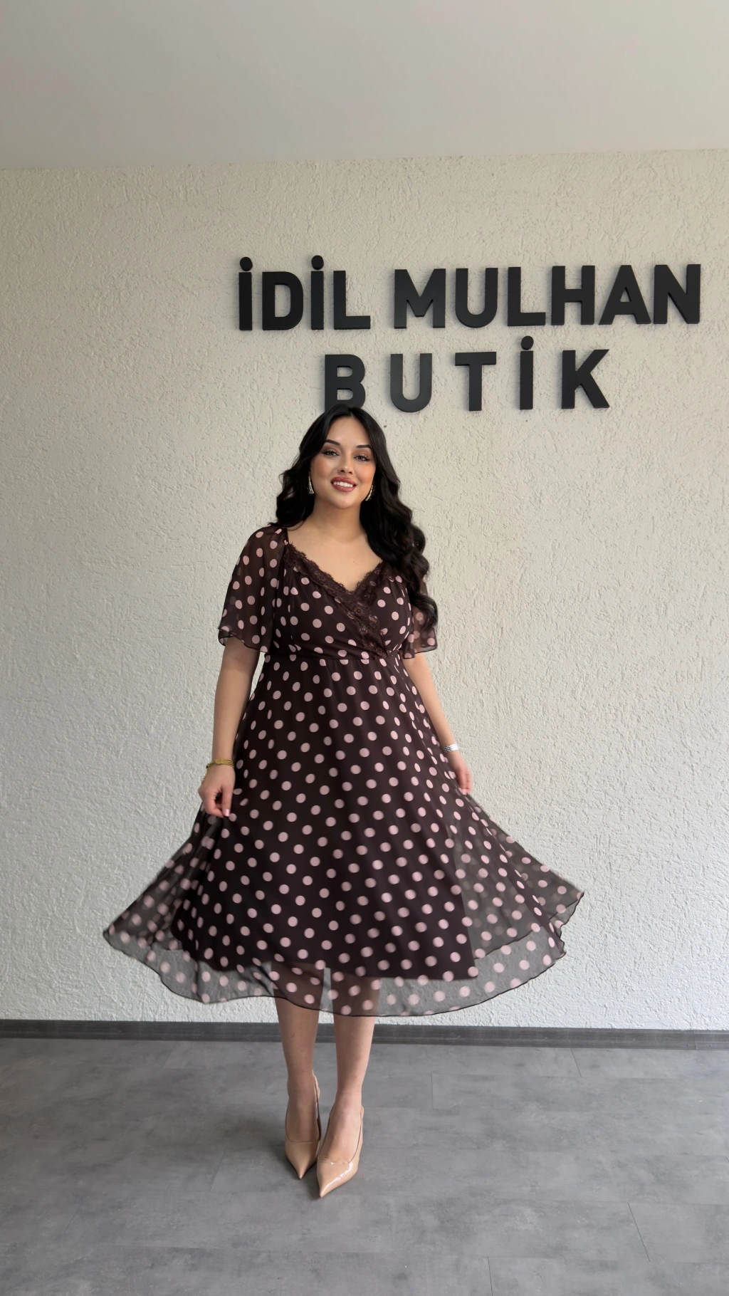 Kahverengi Kruvaze Dantel Detaylı Puantiyeli Elbise