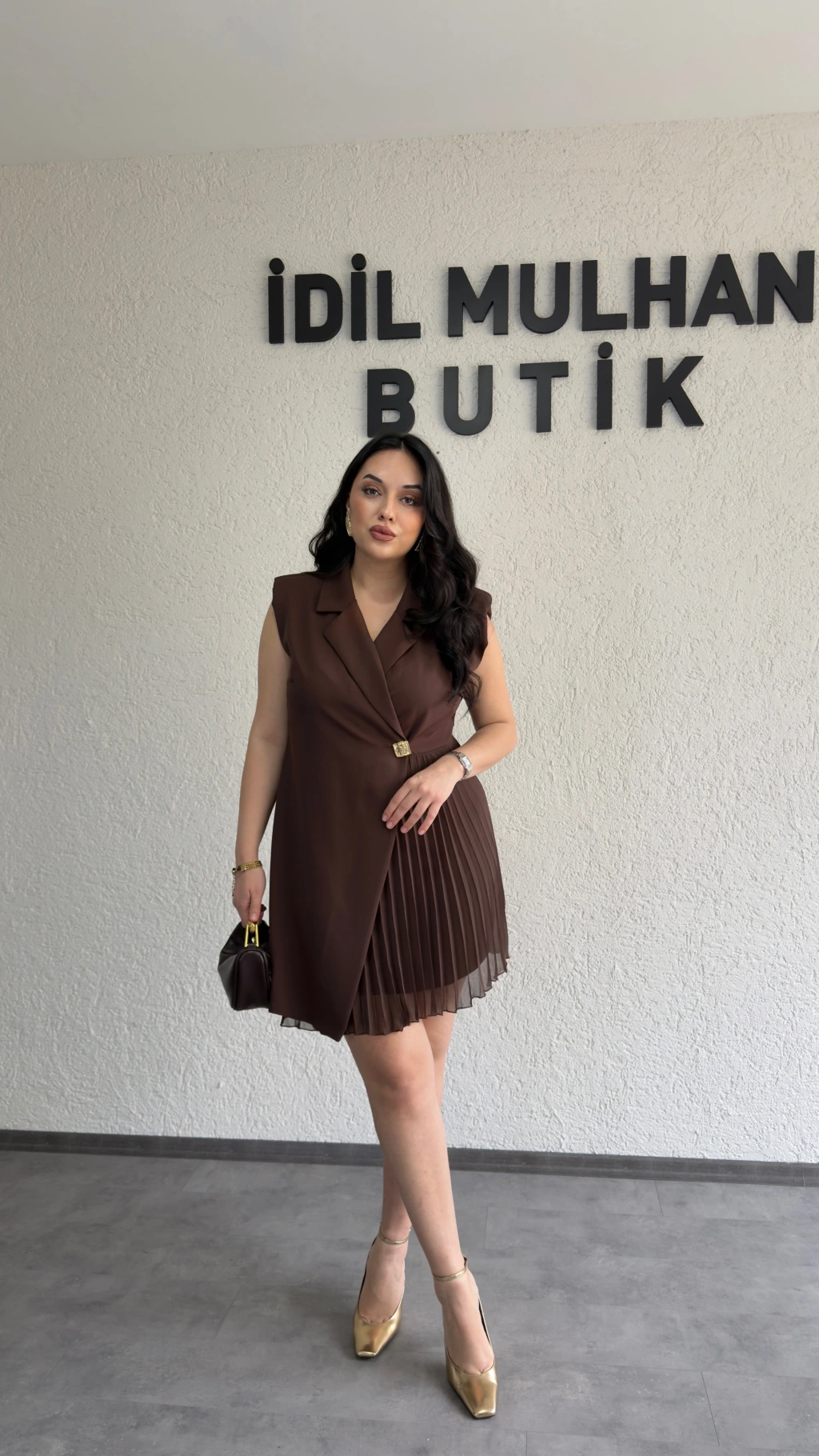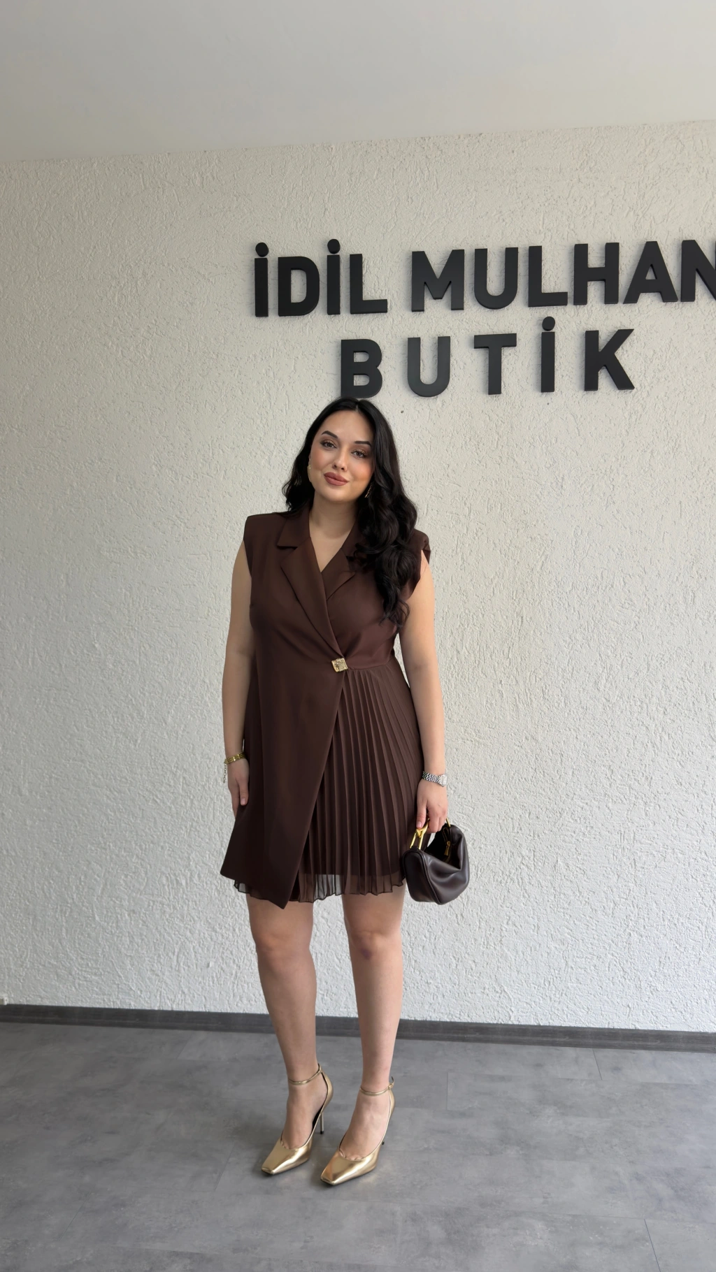 Kahverengi Dantel Detaylı Kruvaze Blazer Elbise