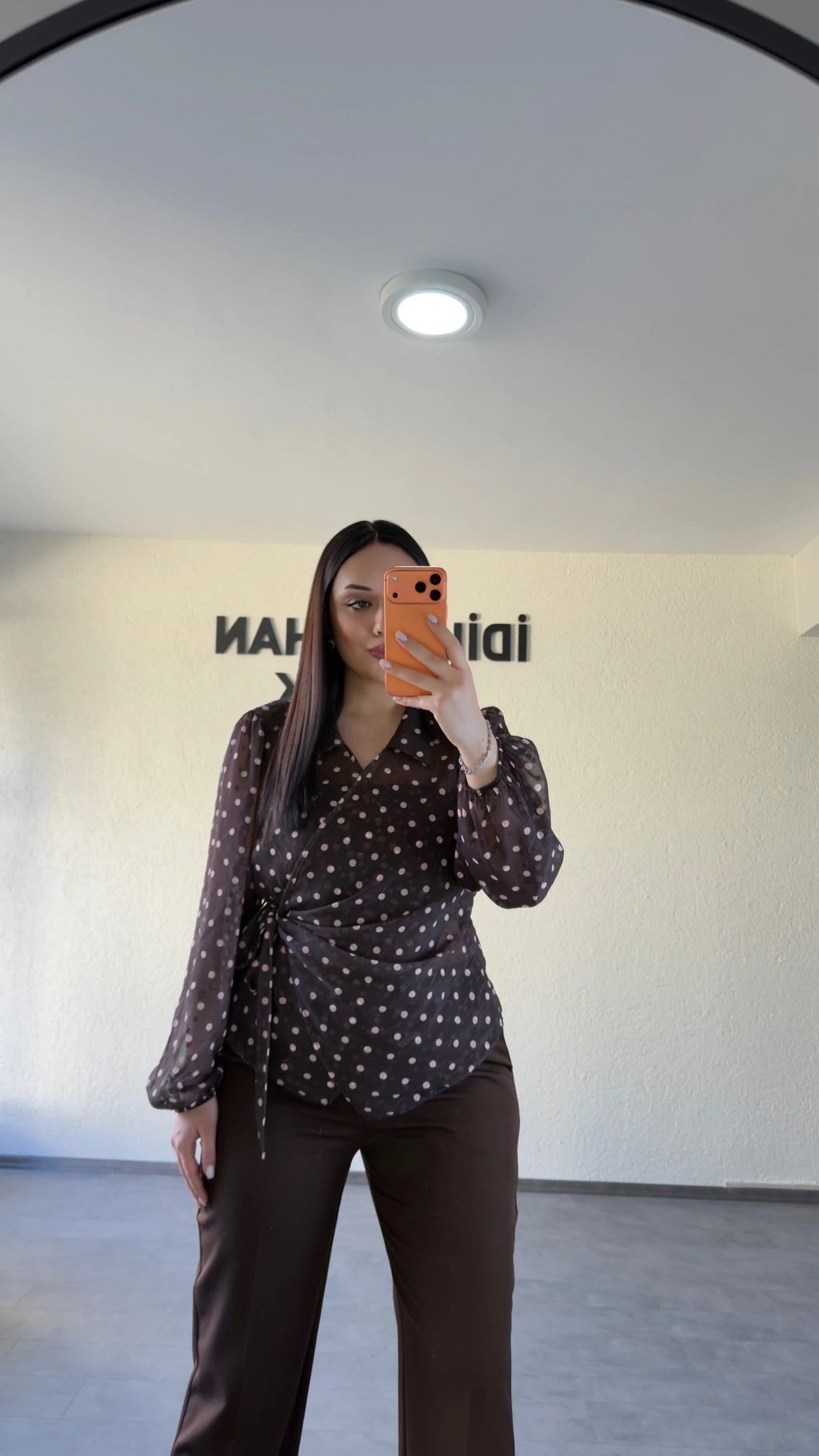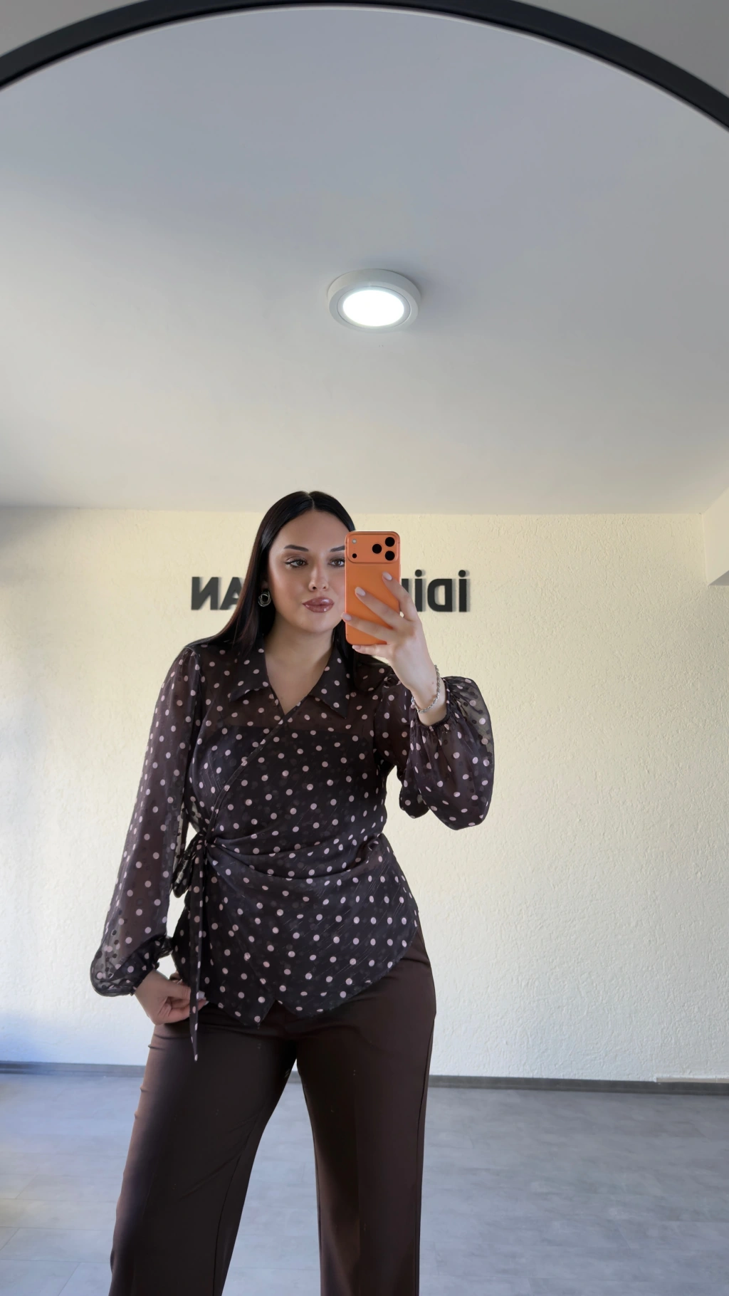 Kahverengi Kruvaze Yan Bağcıklı Puantiyeli Bluz