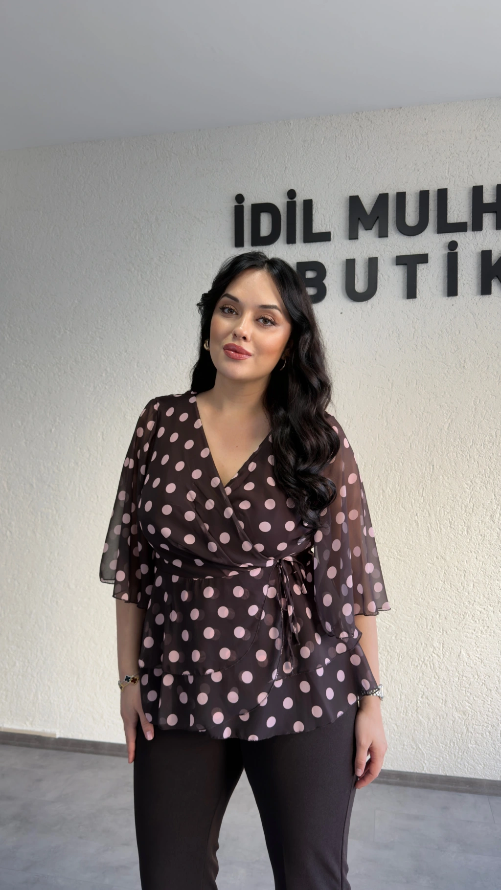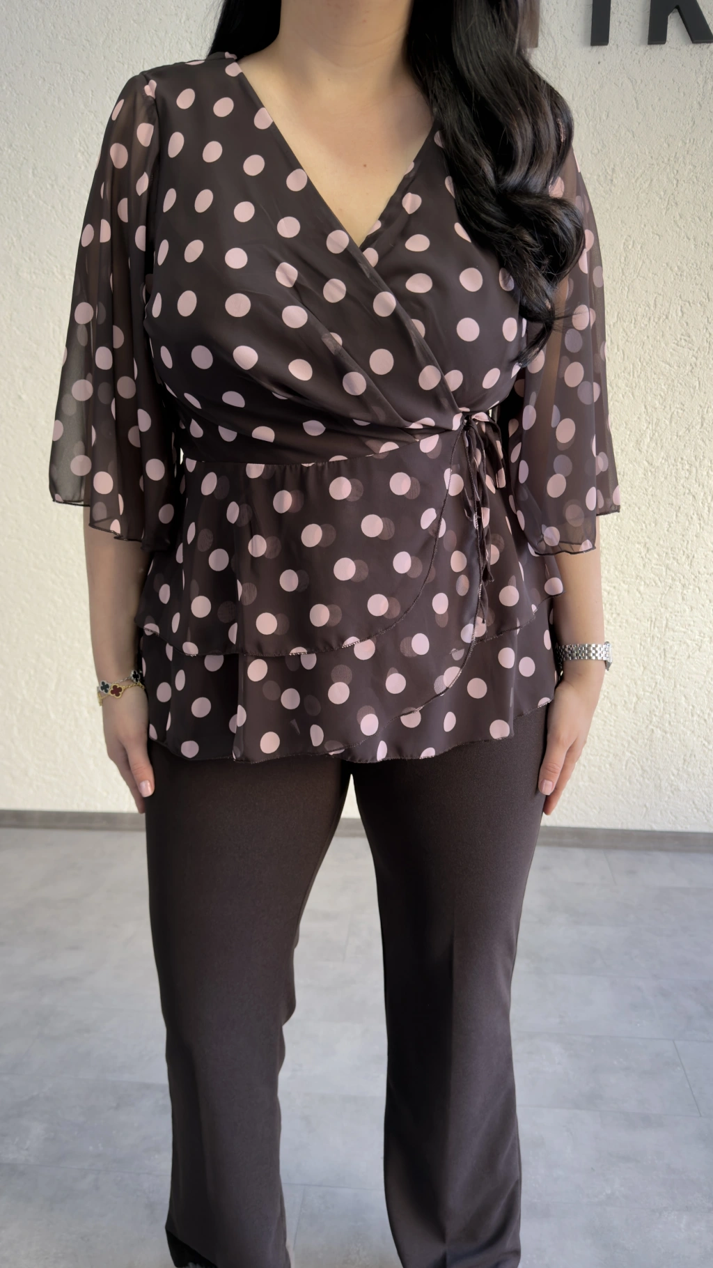 Kahverengi Pembe Puantiyeli Yan Bağcıklı Kruvaze Bluz