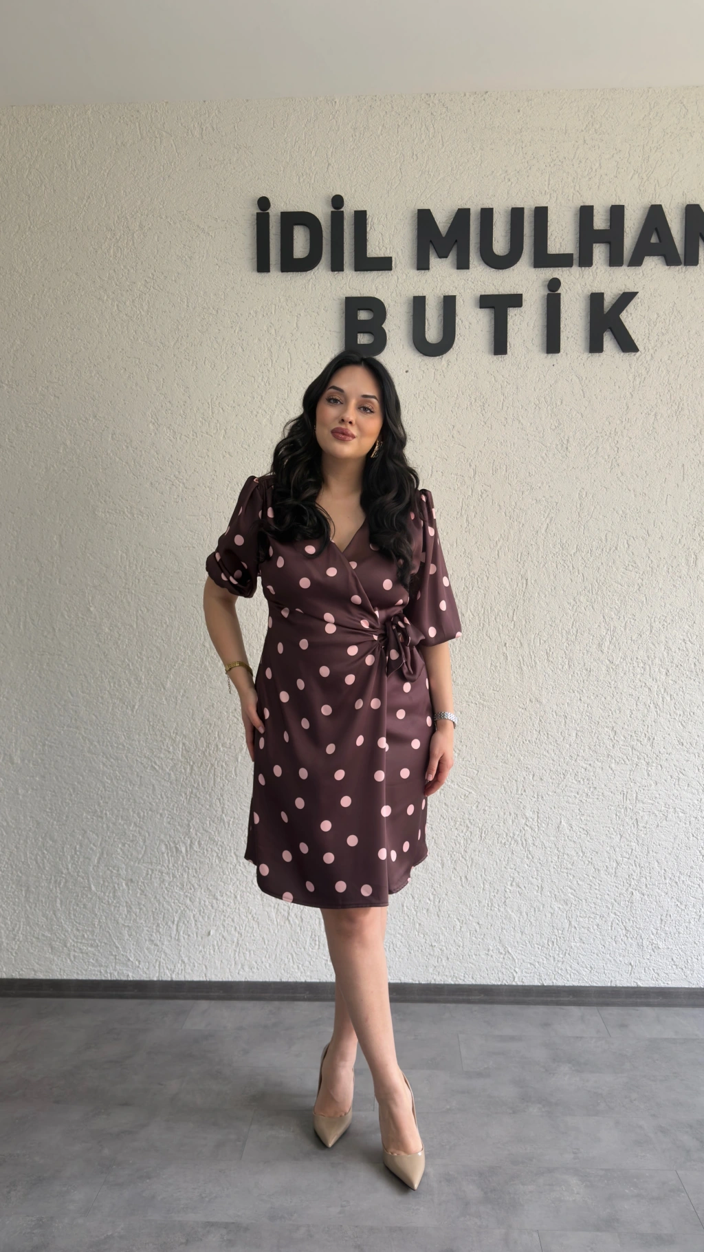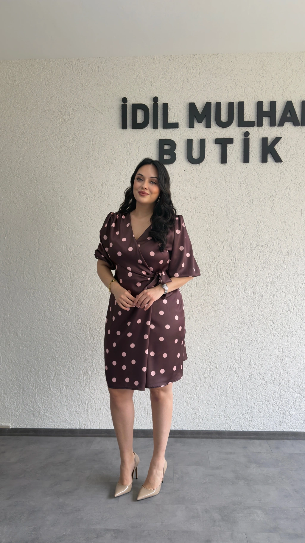 Kahverengi Puantiyeli Kruvaze Kuşaklı Elbise