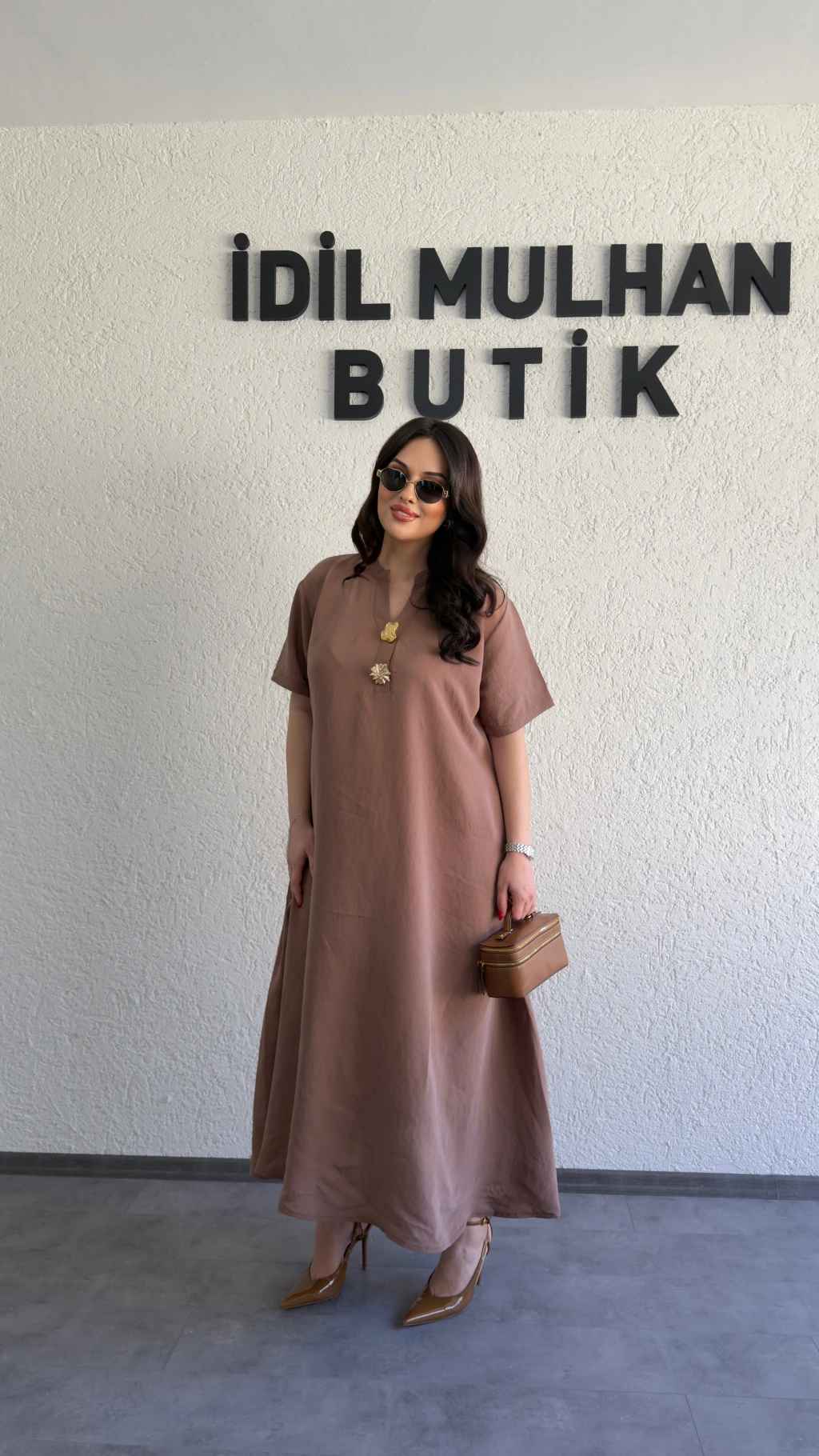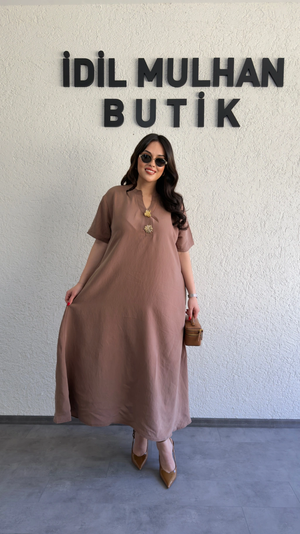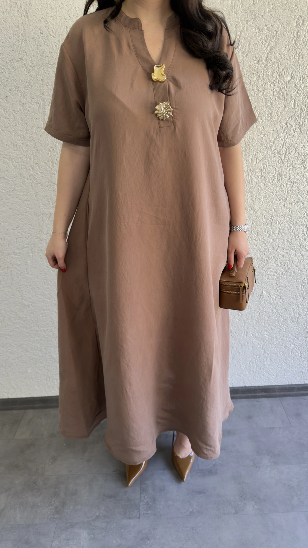 Kahverengi Salaş Kesim Broş Detaylı Elbise