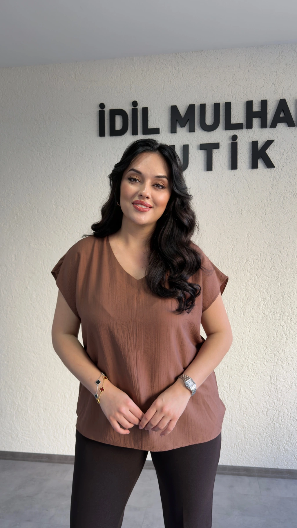 Kahverengi V Yaka Çilek Kumaş Bluz