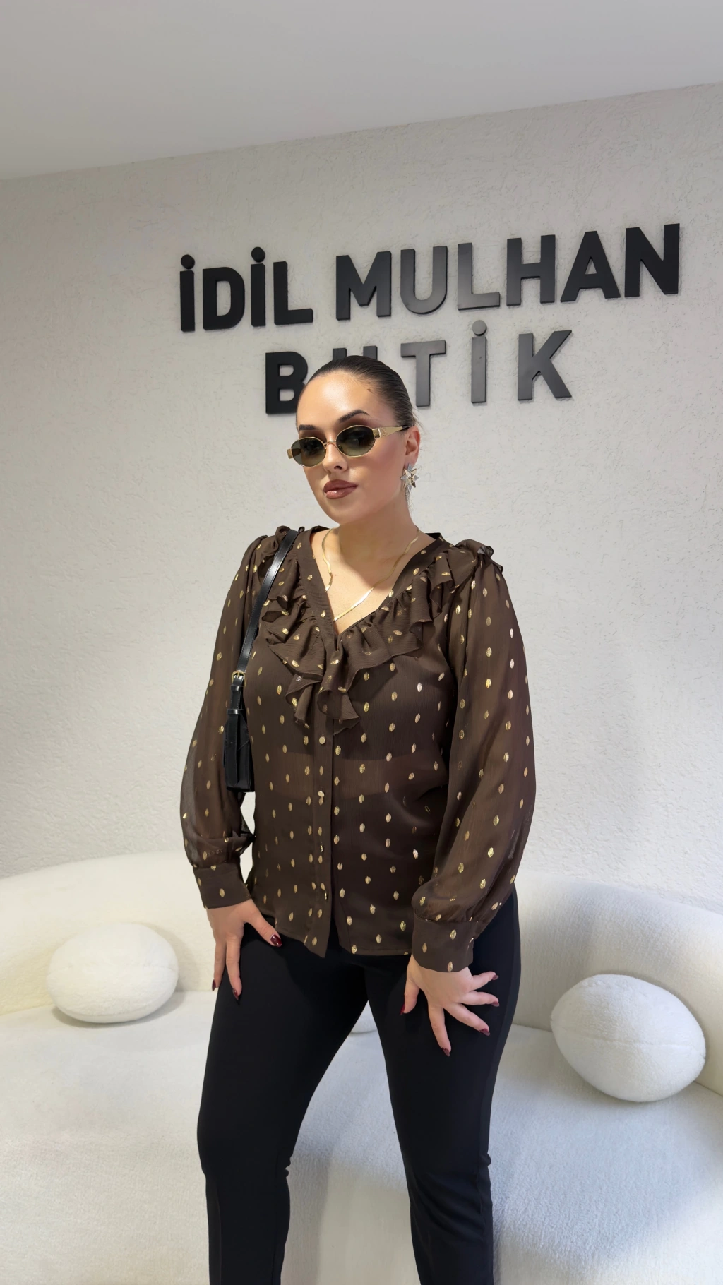 Kahverengi Volanlı Gold Varaklı Bluz