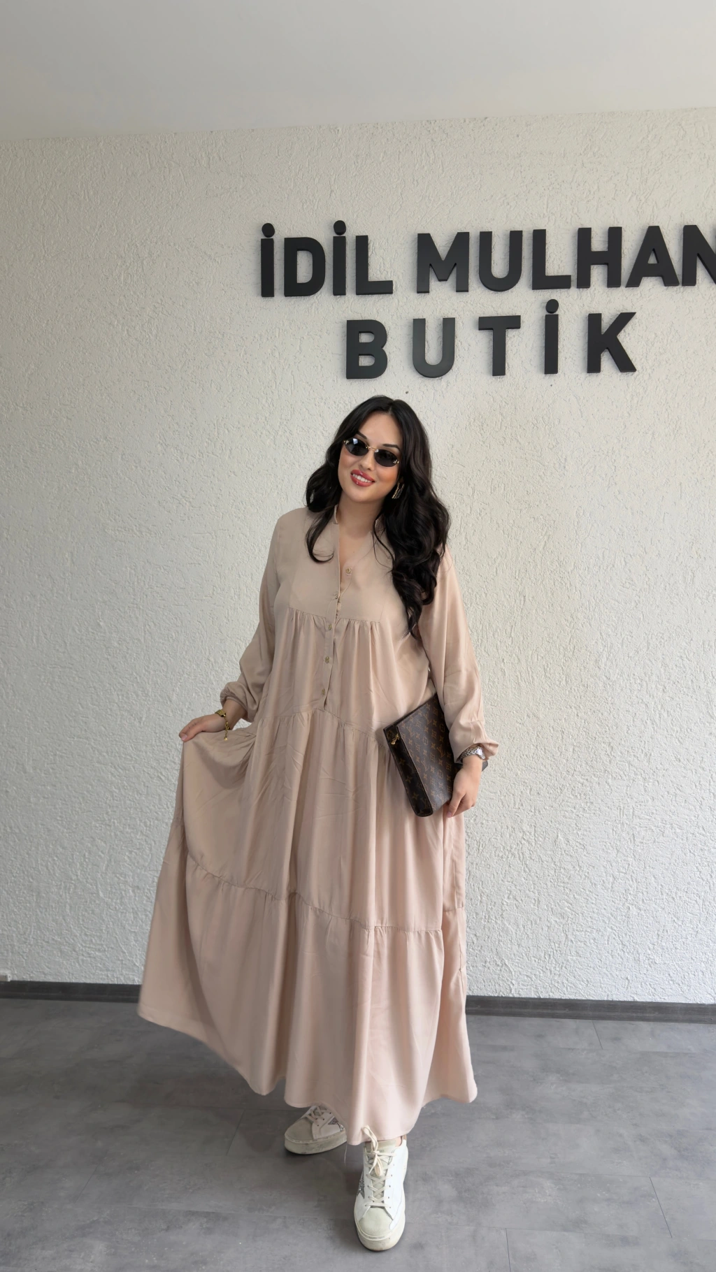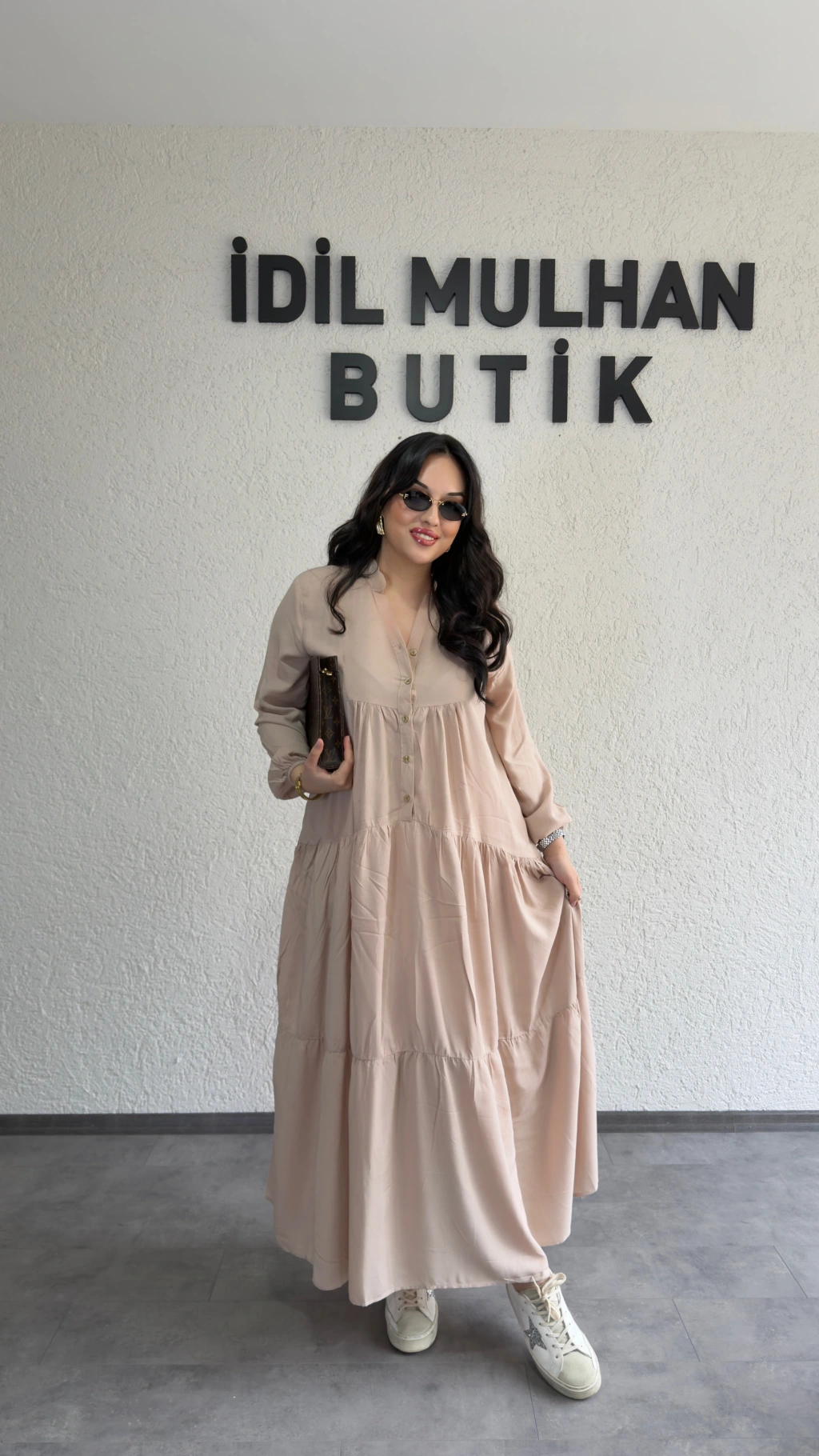 Krem Düğmeli Maxi Fırfır Elbise