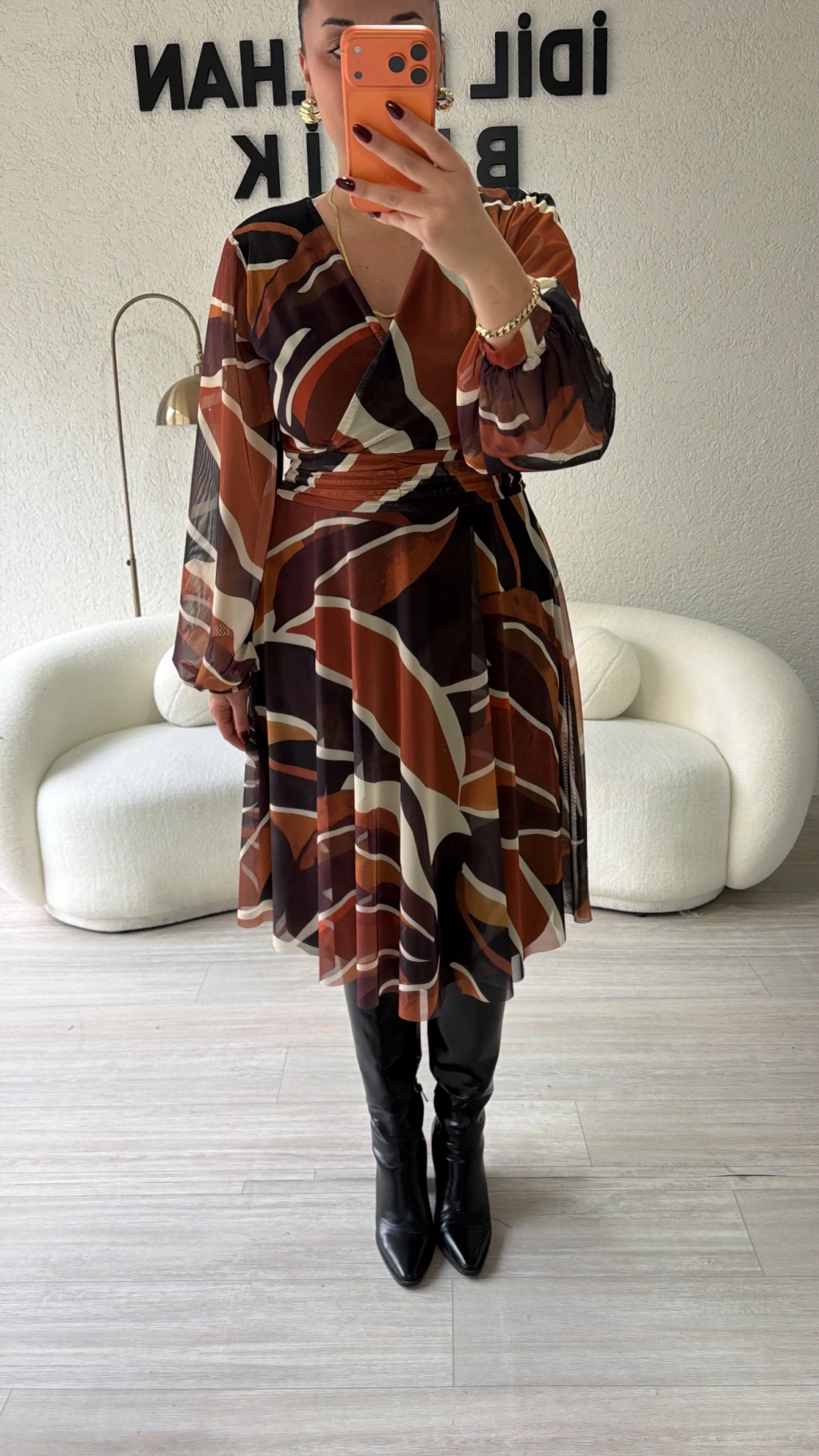 Kahverengi Kruvaze Yaka Sim Dokulu Kuşaklı Elbise