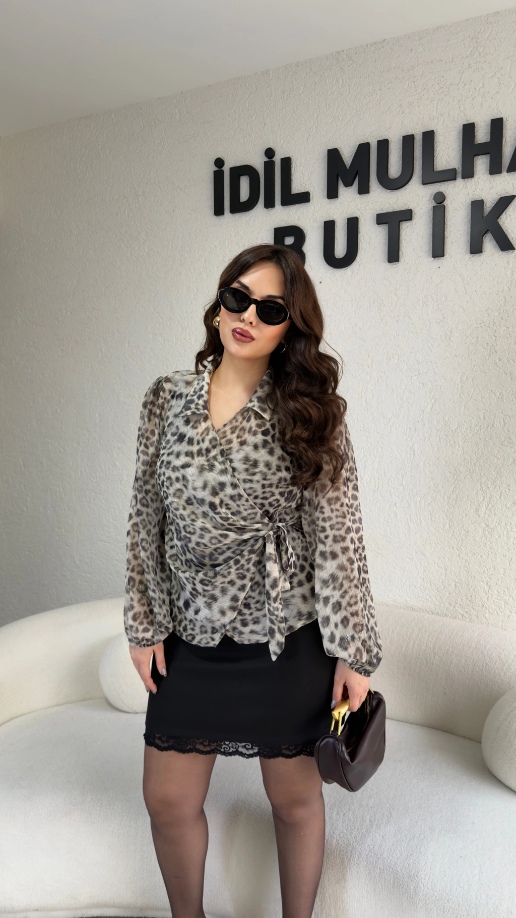 Kruvaze Yan Bağcıklı Leopar Bluz