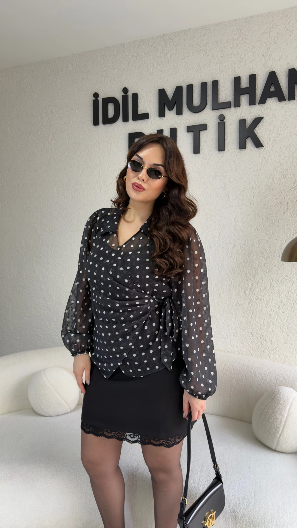 Kruvaze Yan Bağcıklı Puantiyeli Bluz