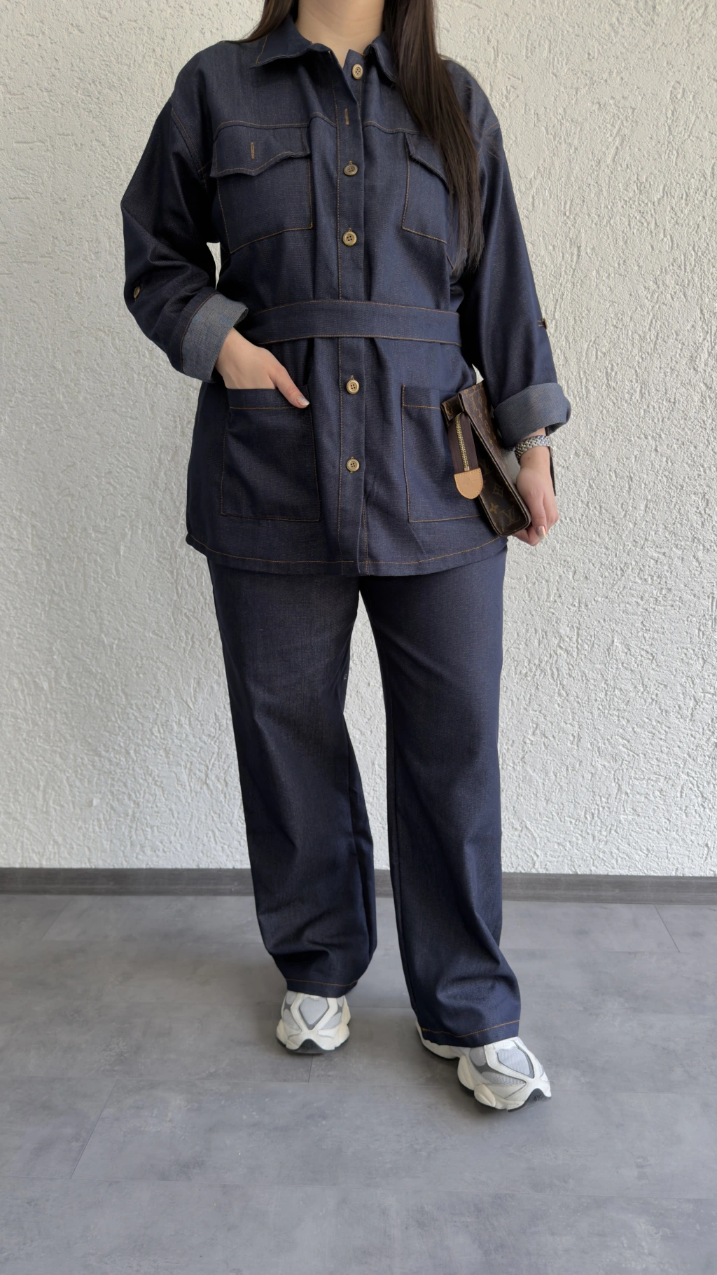 Lacivert Düğmeli Kemerli Jean Takım