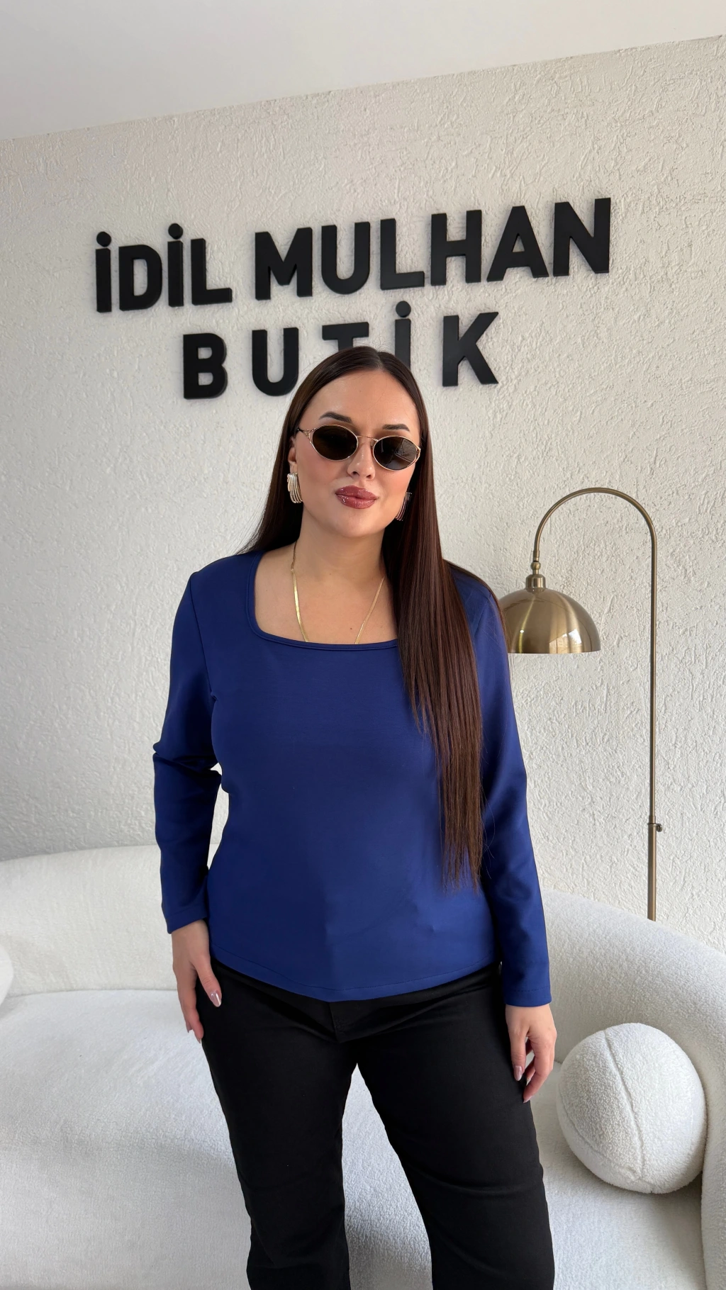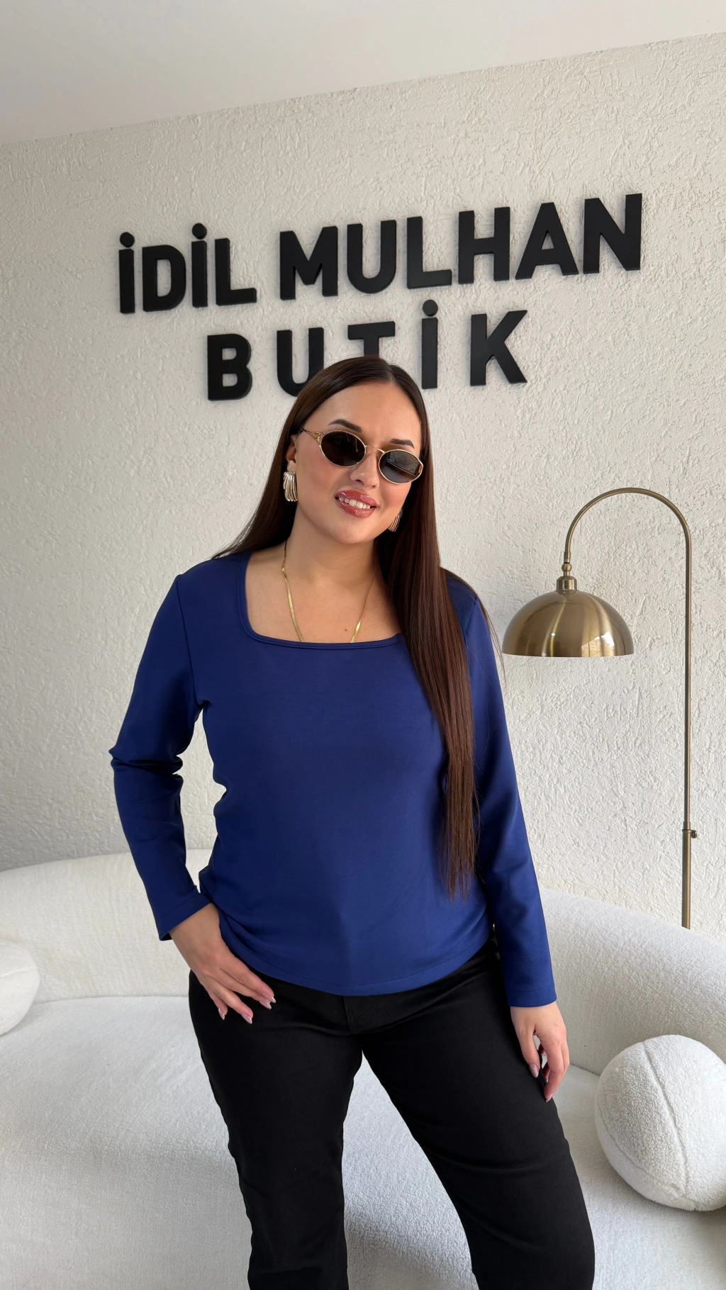 Lacivert Kare Yaka Oysh Kumaş Bluz