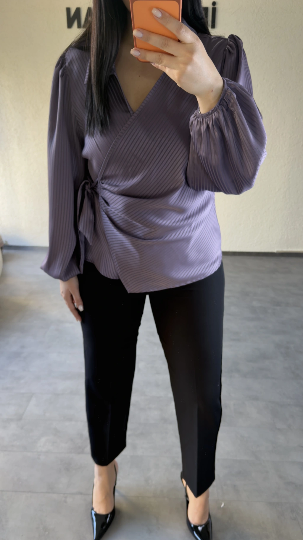 Lila Yan Bağlamalı Nispet Kumaş Bluz