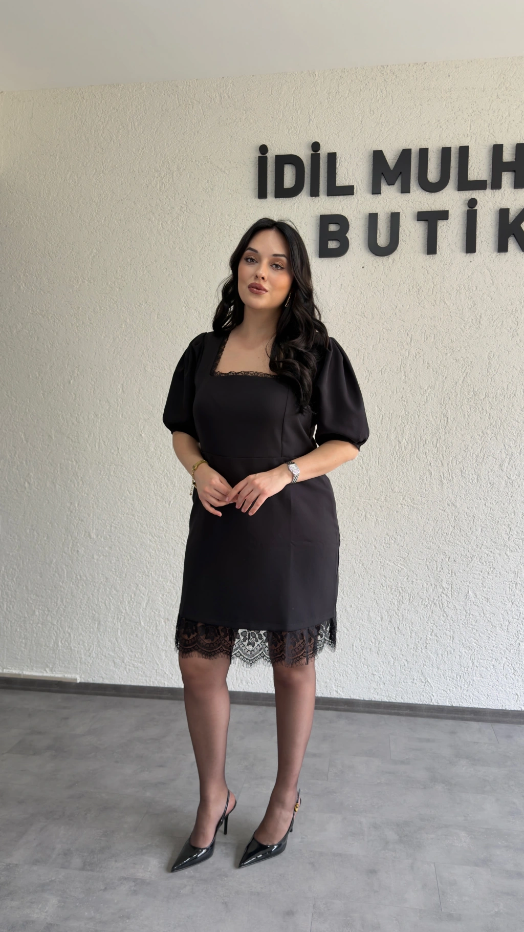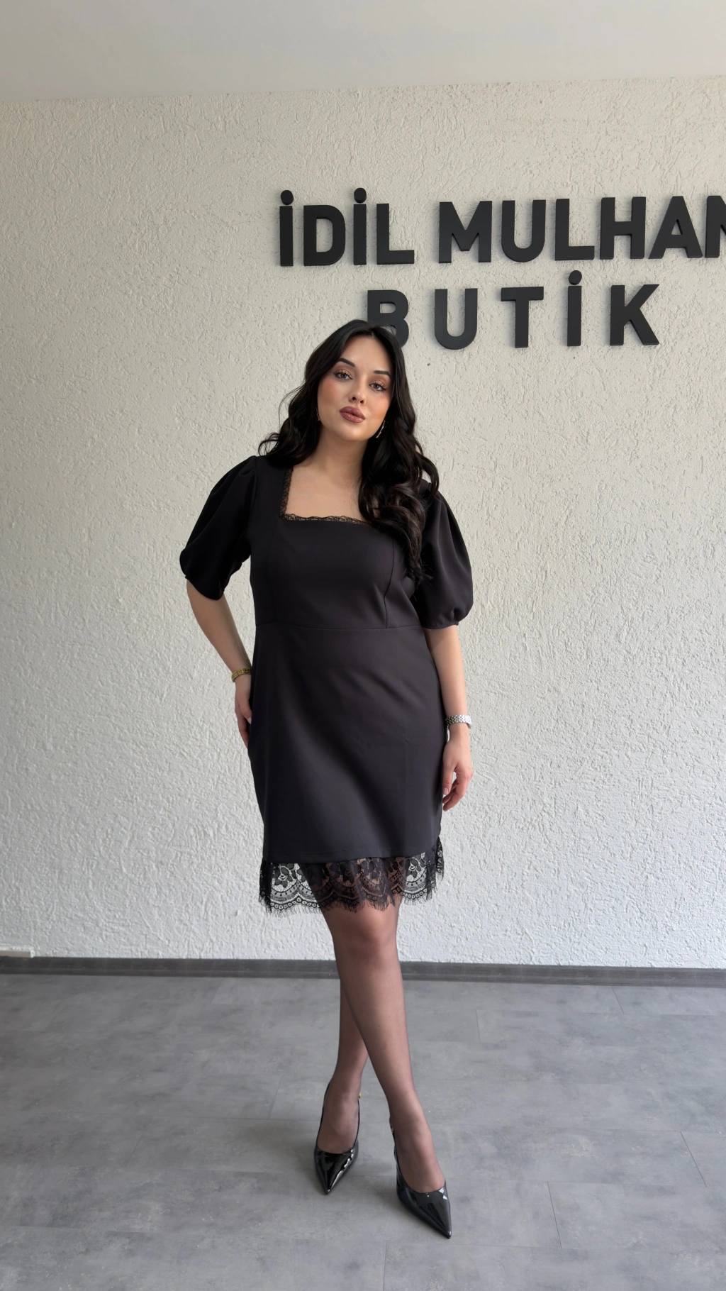 Siyah Balon Kol Kare Yaka Dantel Detaylı Elbise