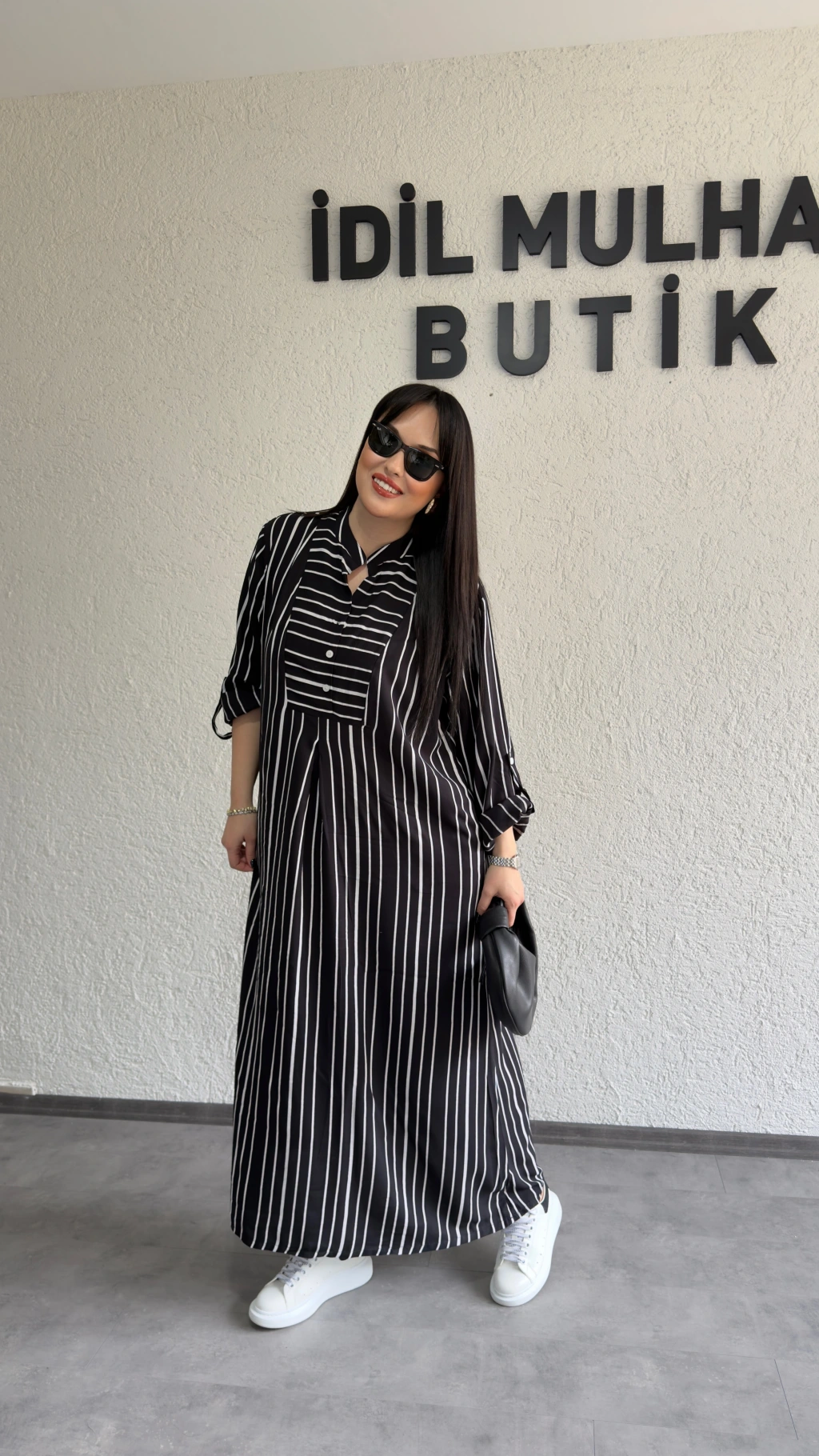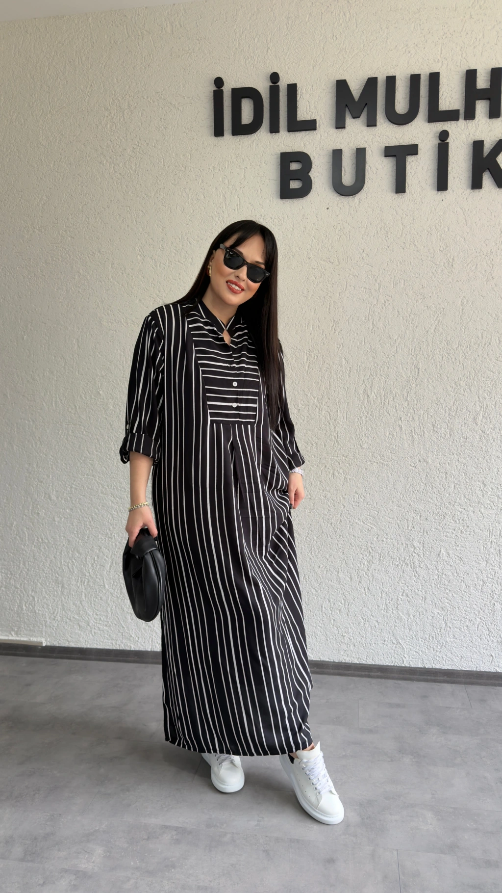 Siyah Beyaz Çizgili Rahat Kesim Elbise