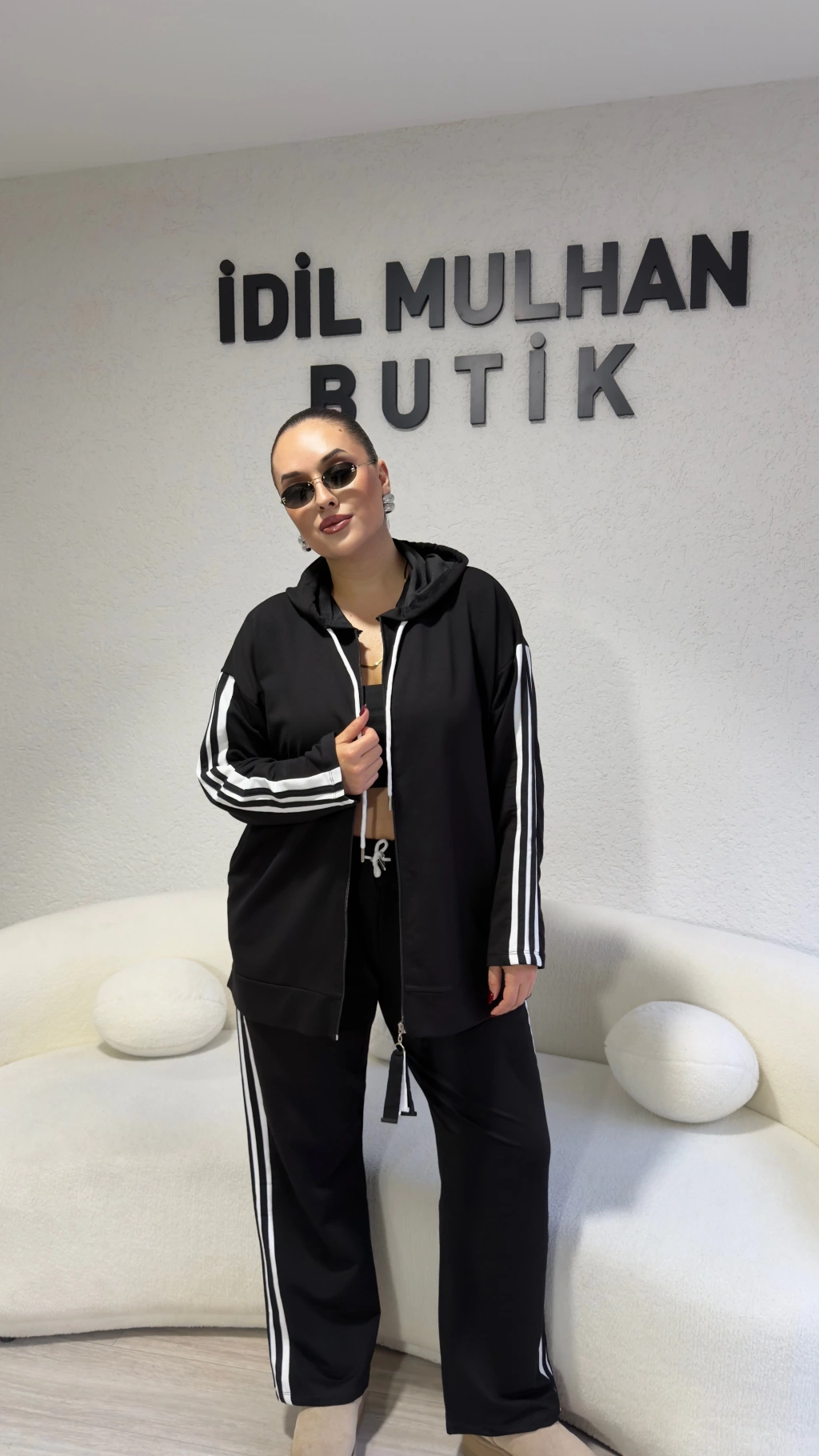 Siyah Beyaz Şeritli Kapşonlu Takım