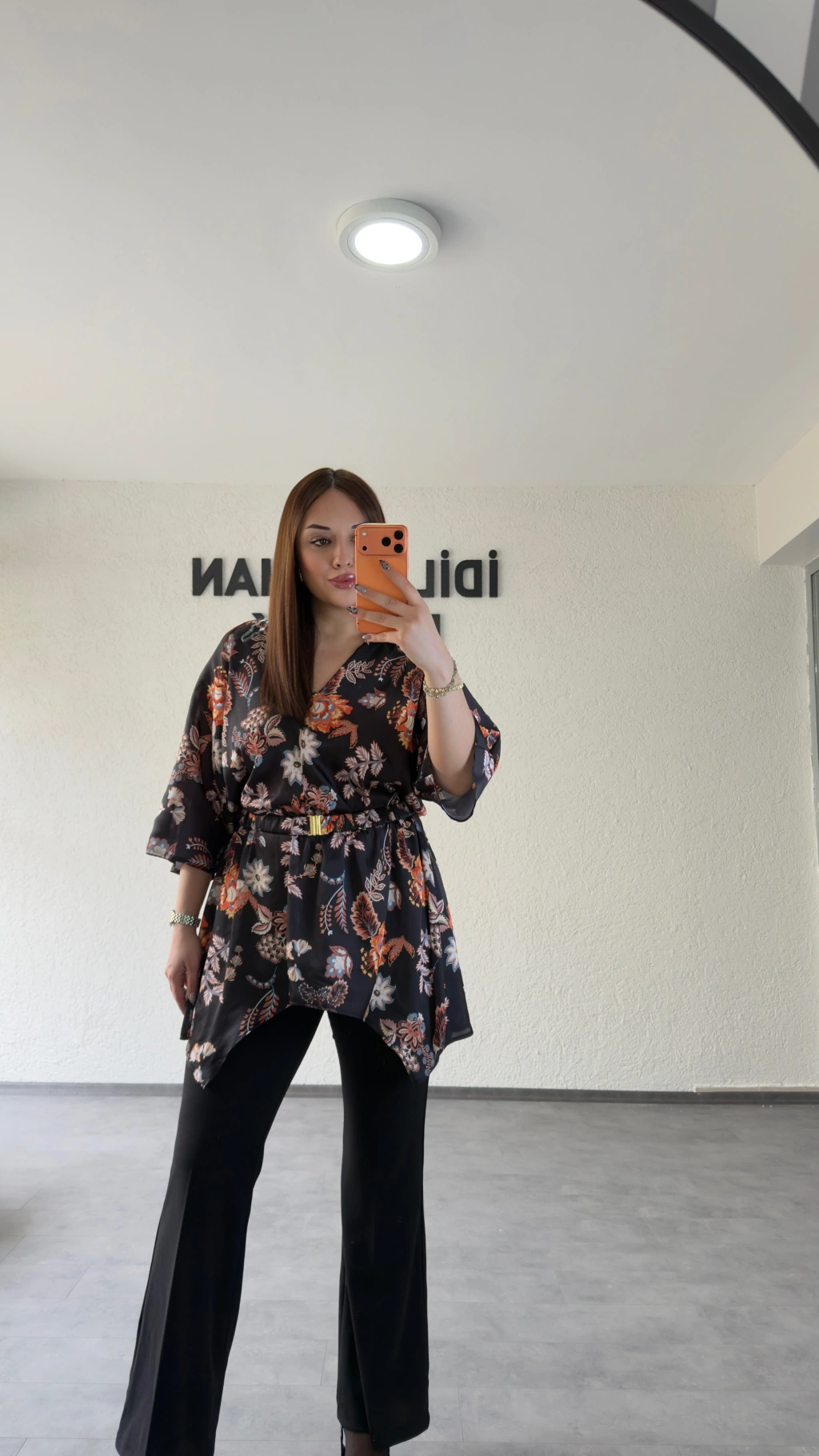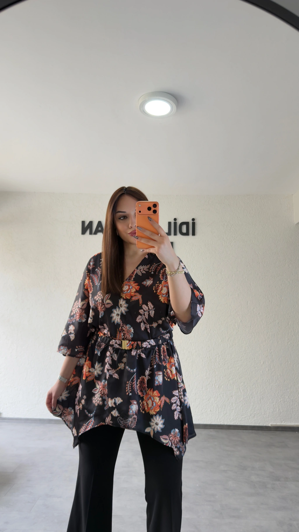 Siyah Çiçek Desenli Kemer Detaylı Dökümlü Bluz