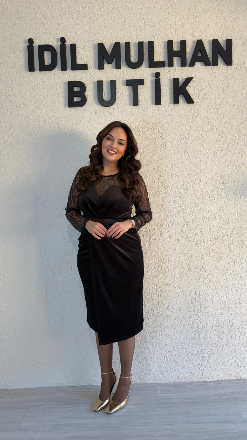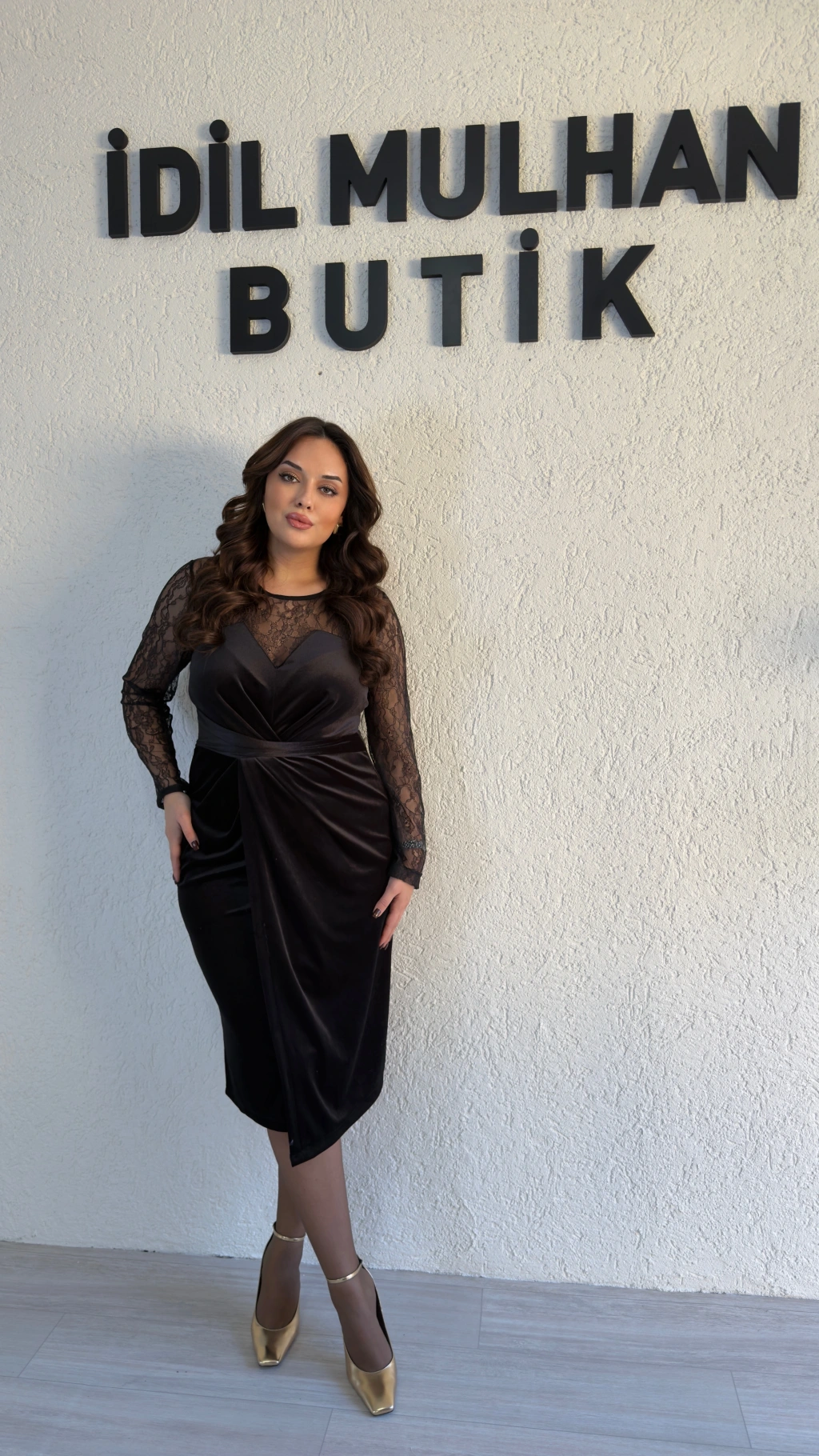 Kahverengi Şifon Kol Taşlı Bağlamalı Elbise