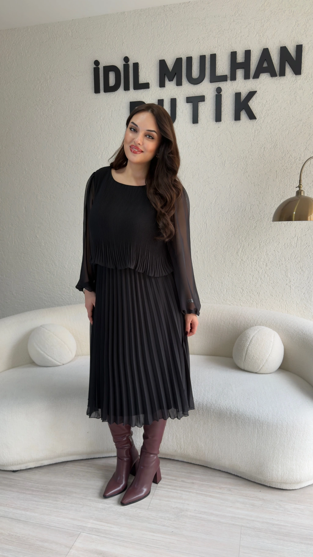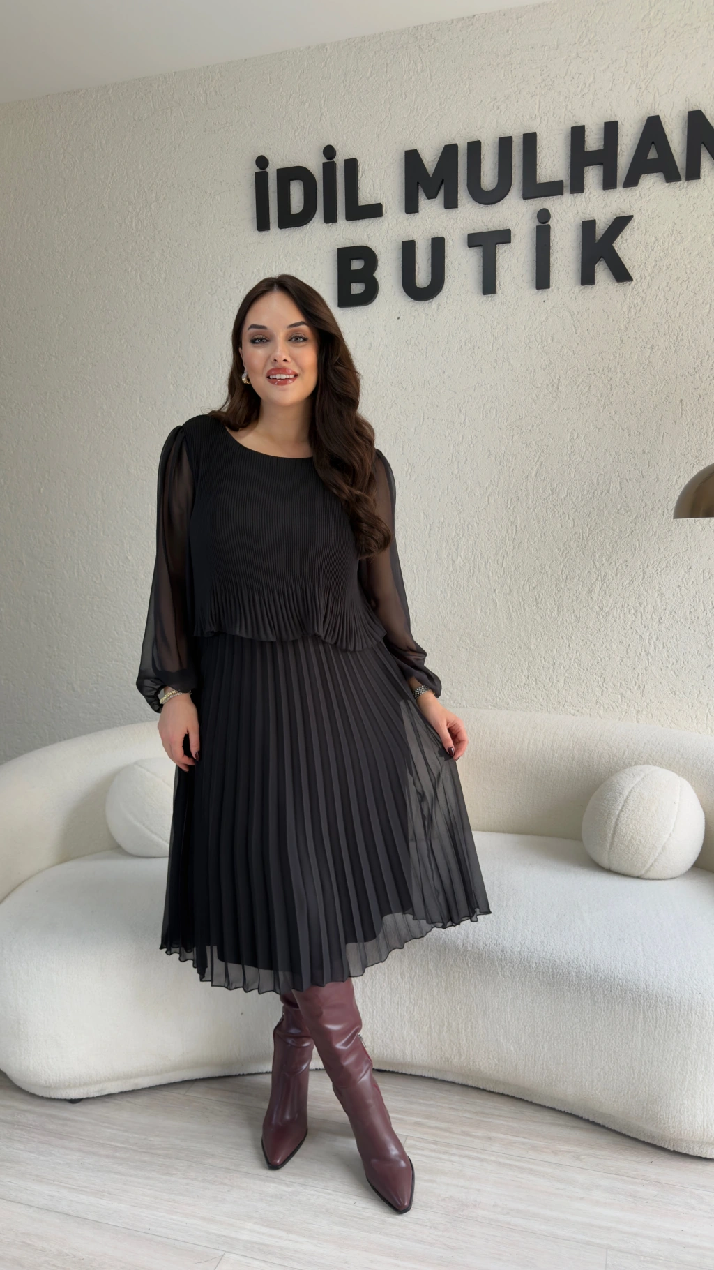 Siyah Dökümlü Piliseli Midi Elbise