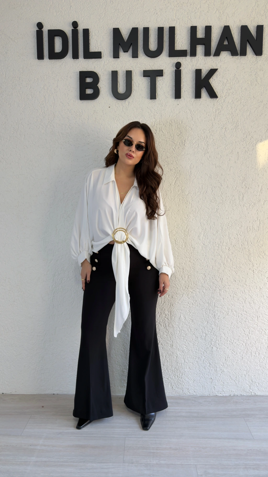 Beyaz Gold Tokalı Bağlamalı Bluz