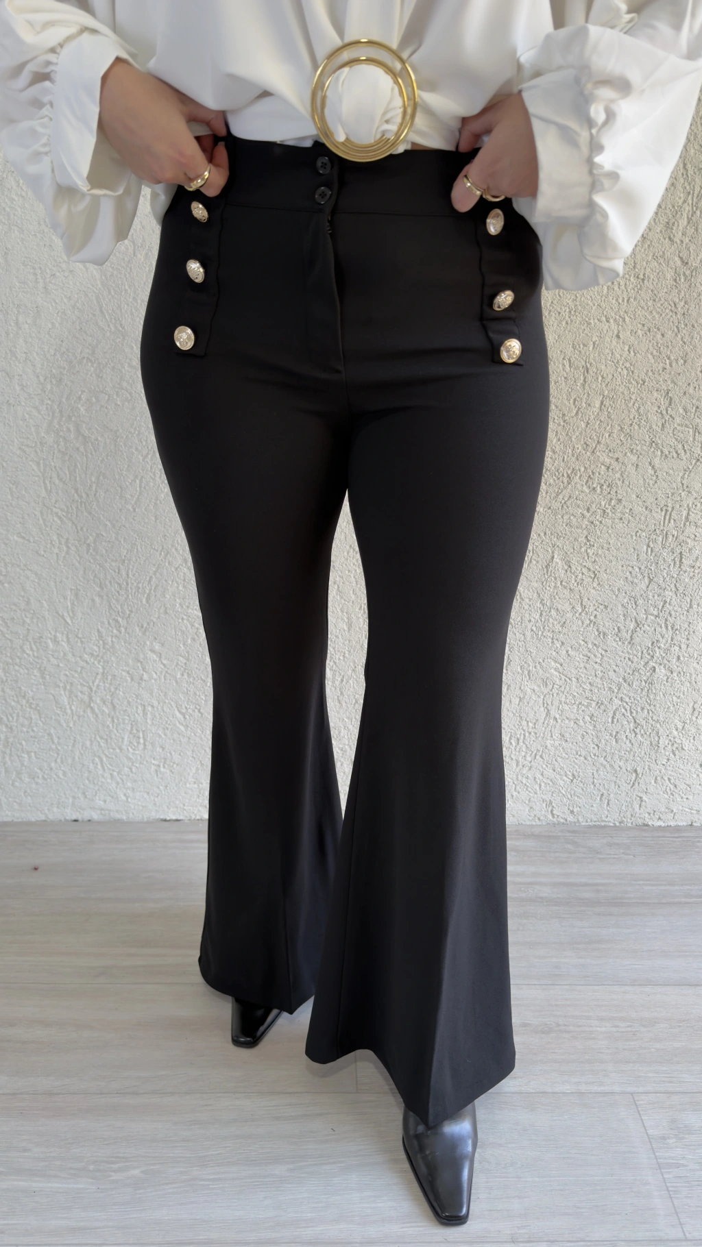 Siyah Gold Düğmeli İspanyol Paça Pantolon