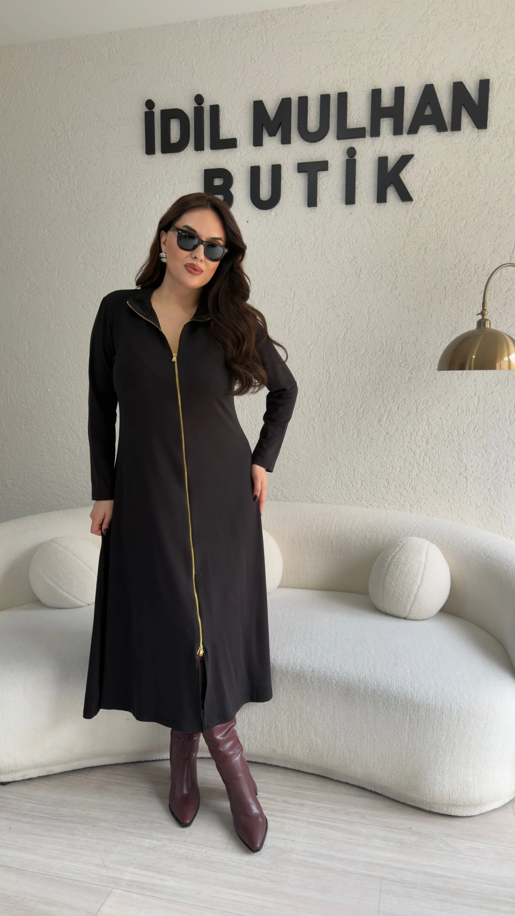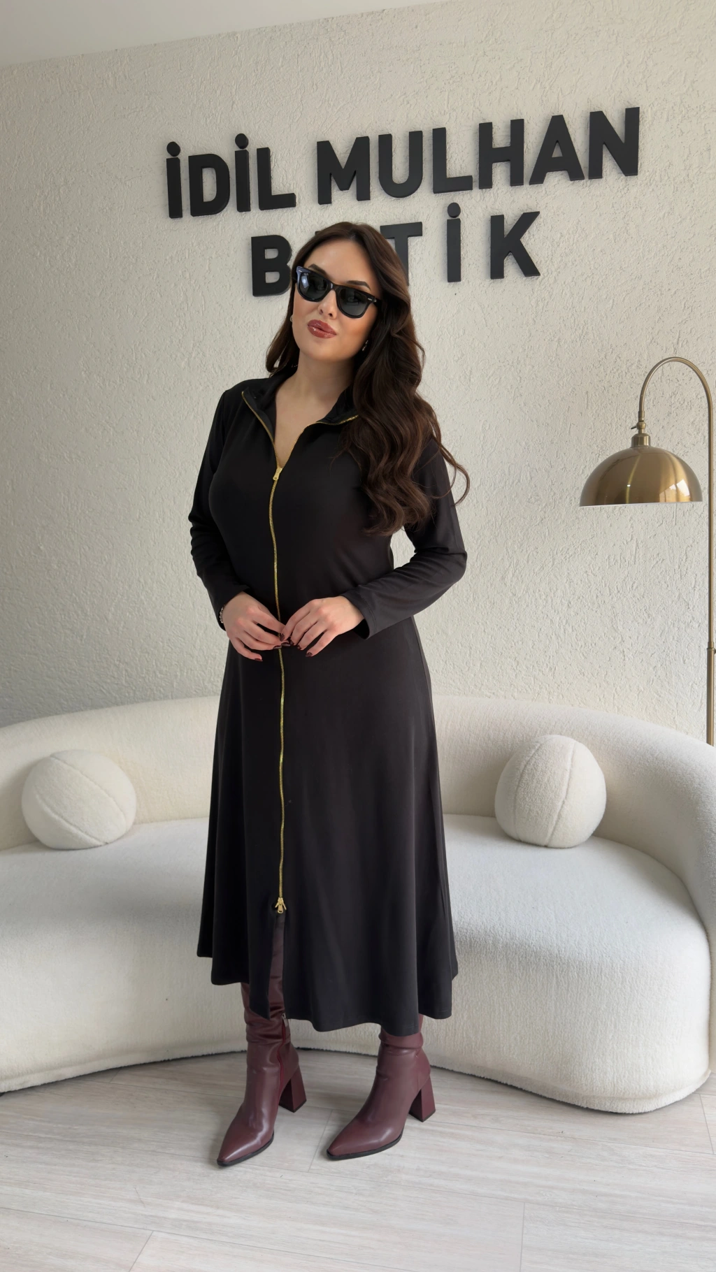 Siyah Gold Fermuarlı Oysh Kumaş Elbise