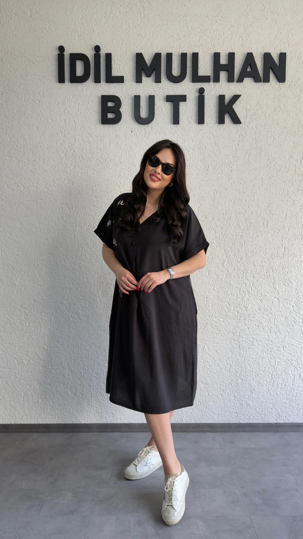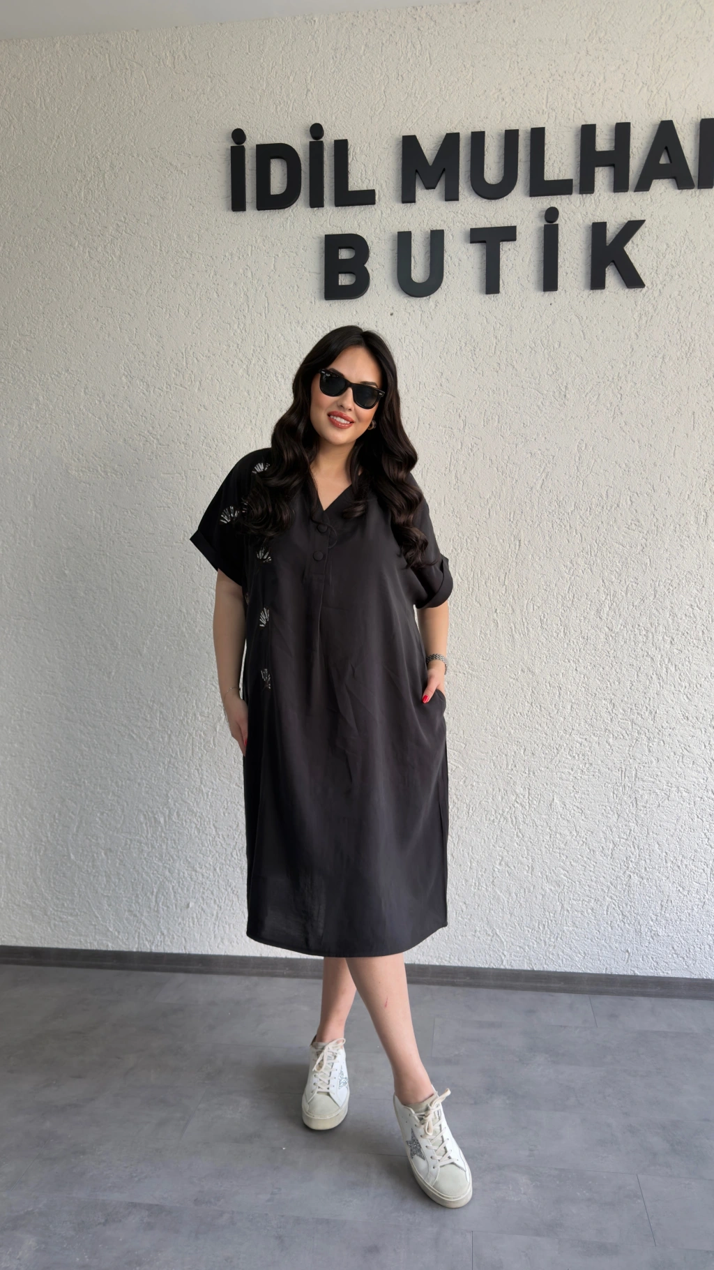 Siyah İşlemeli Düğme Detaylı Salaş Elbise