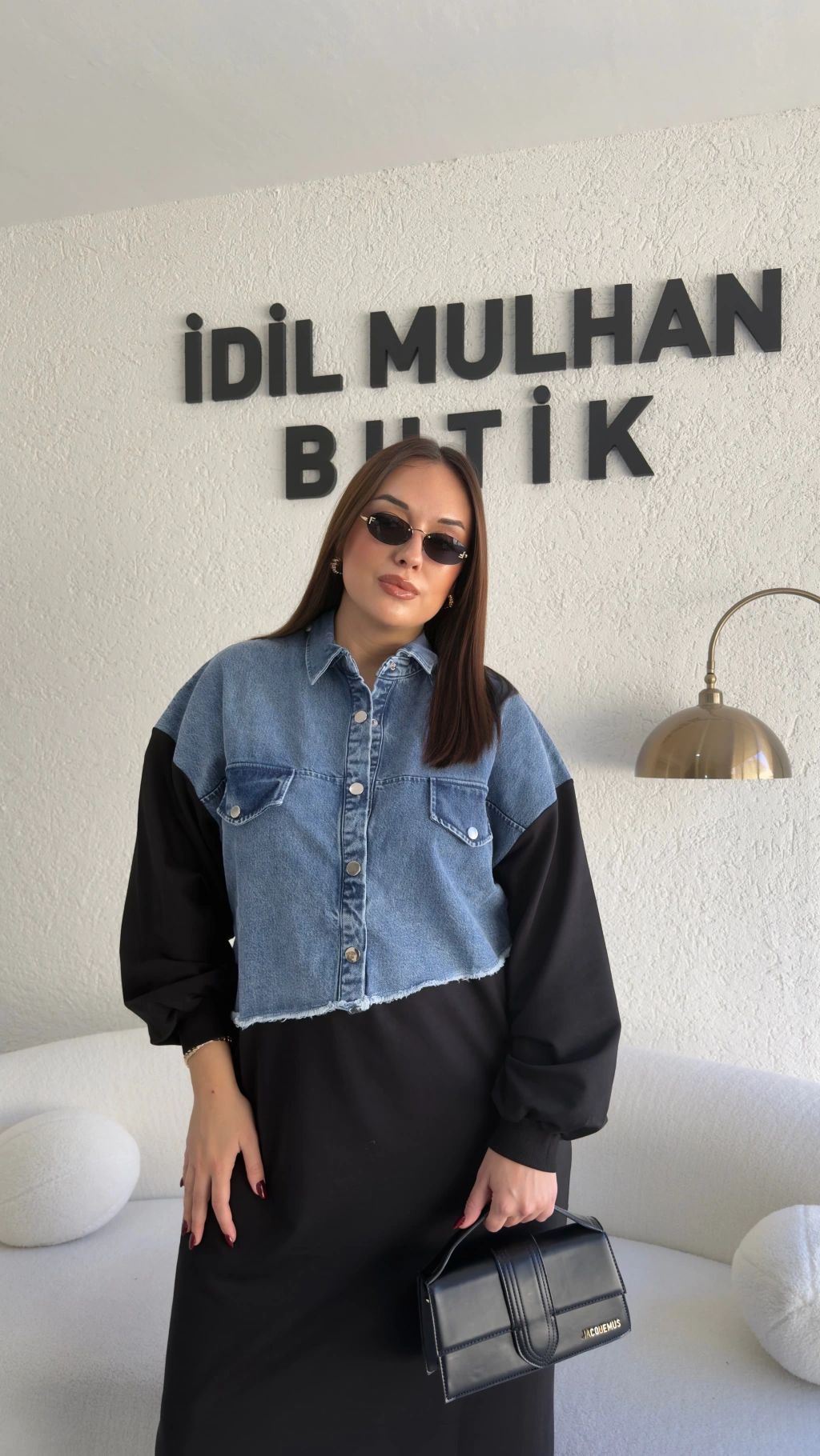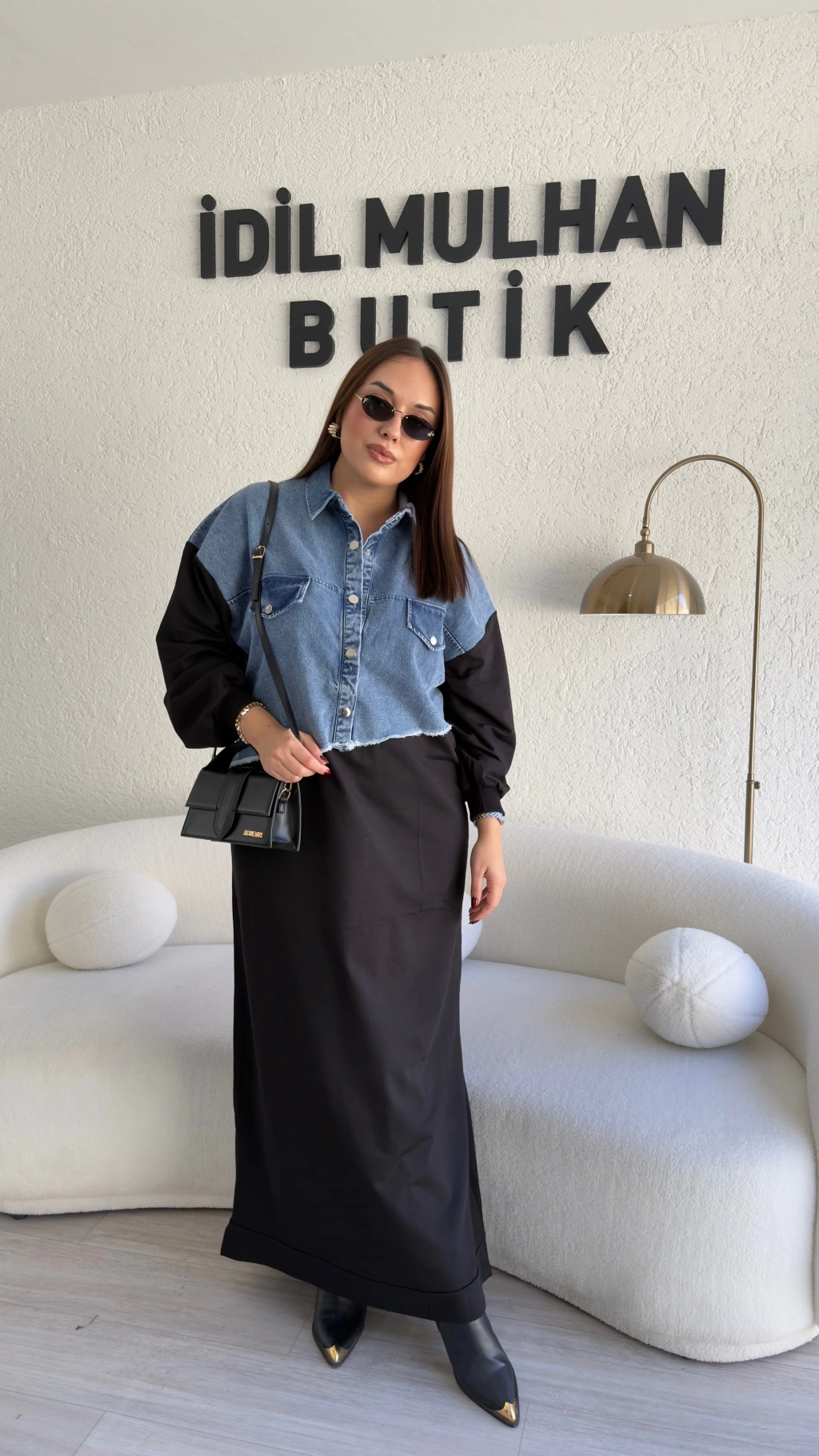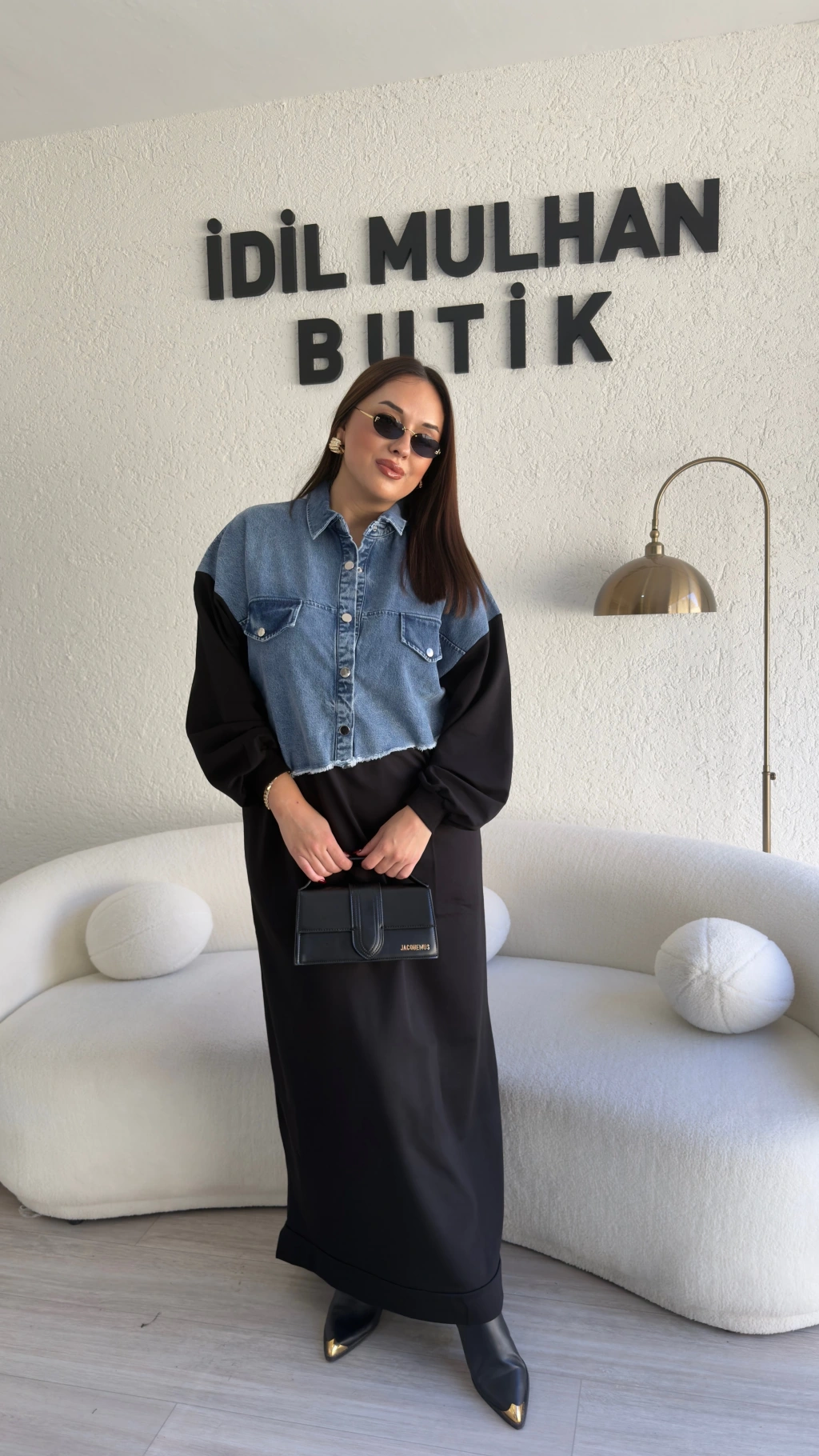 Siyah Kruvaze Yaka Sim Dokulu Kuşaklı Elbise