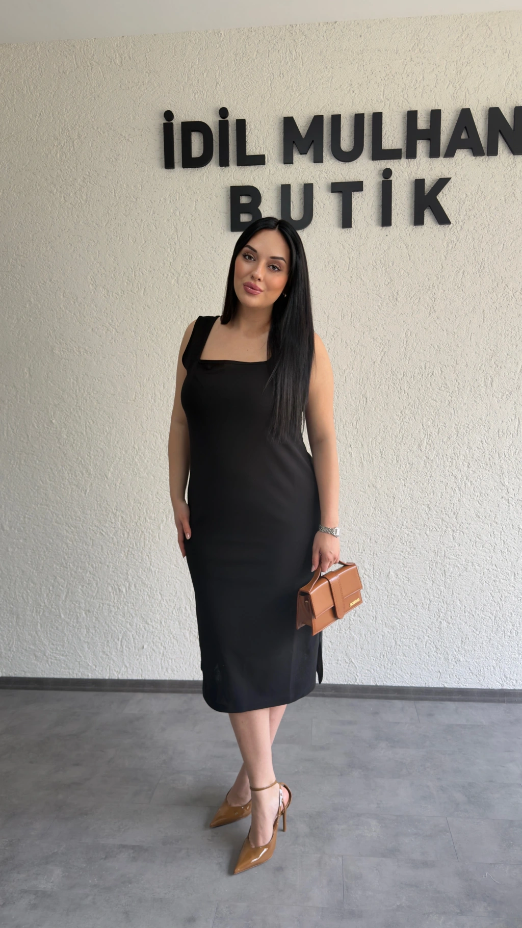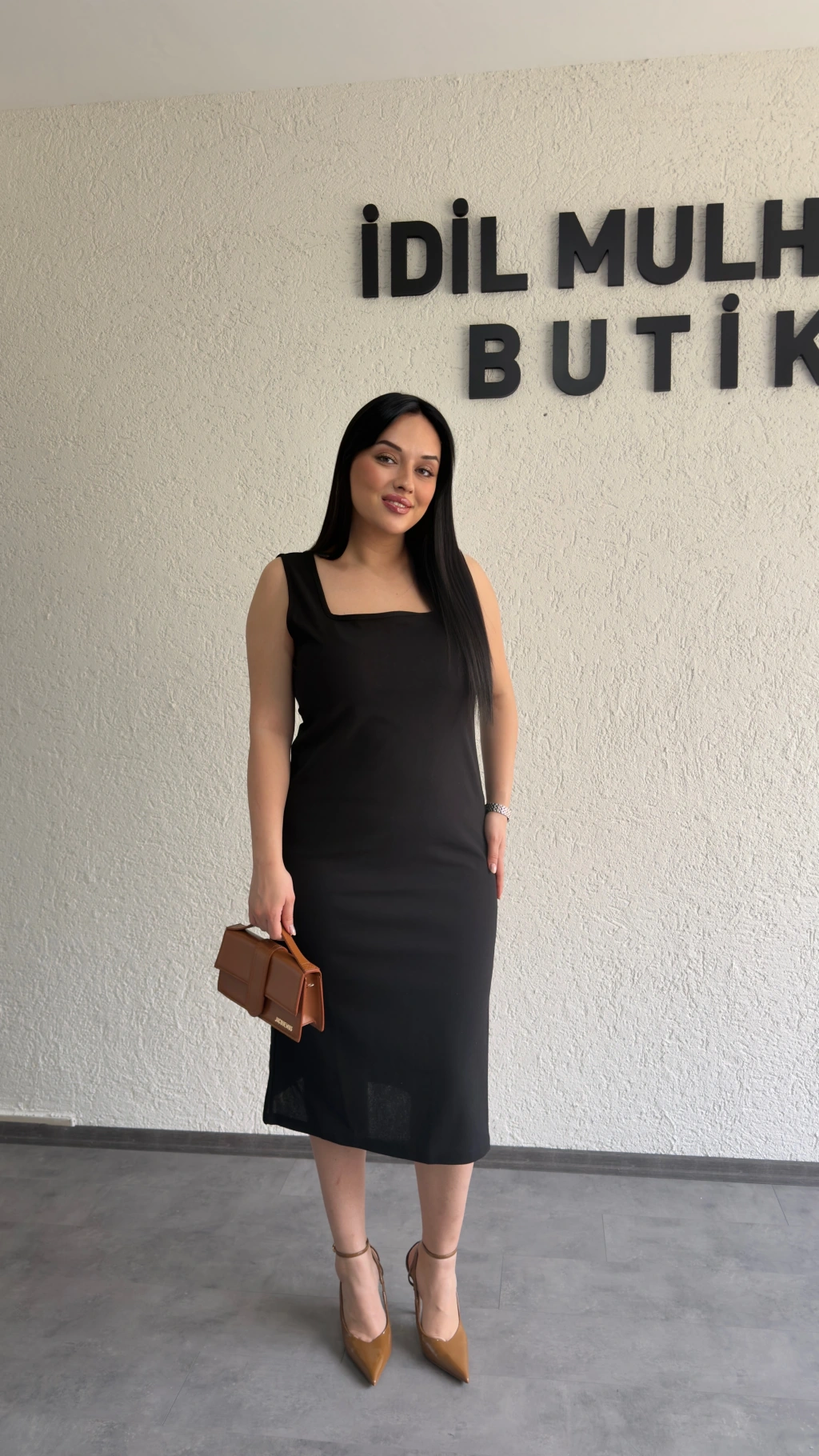 Siyah Kare Yaka Krep Elbise