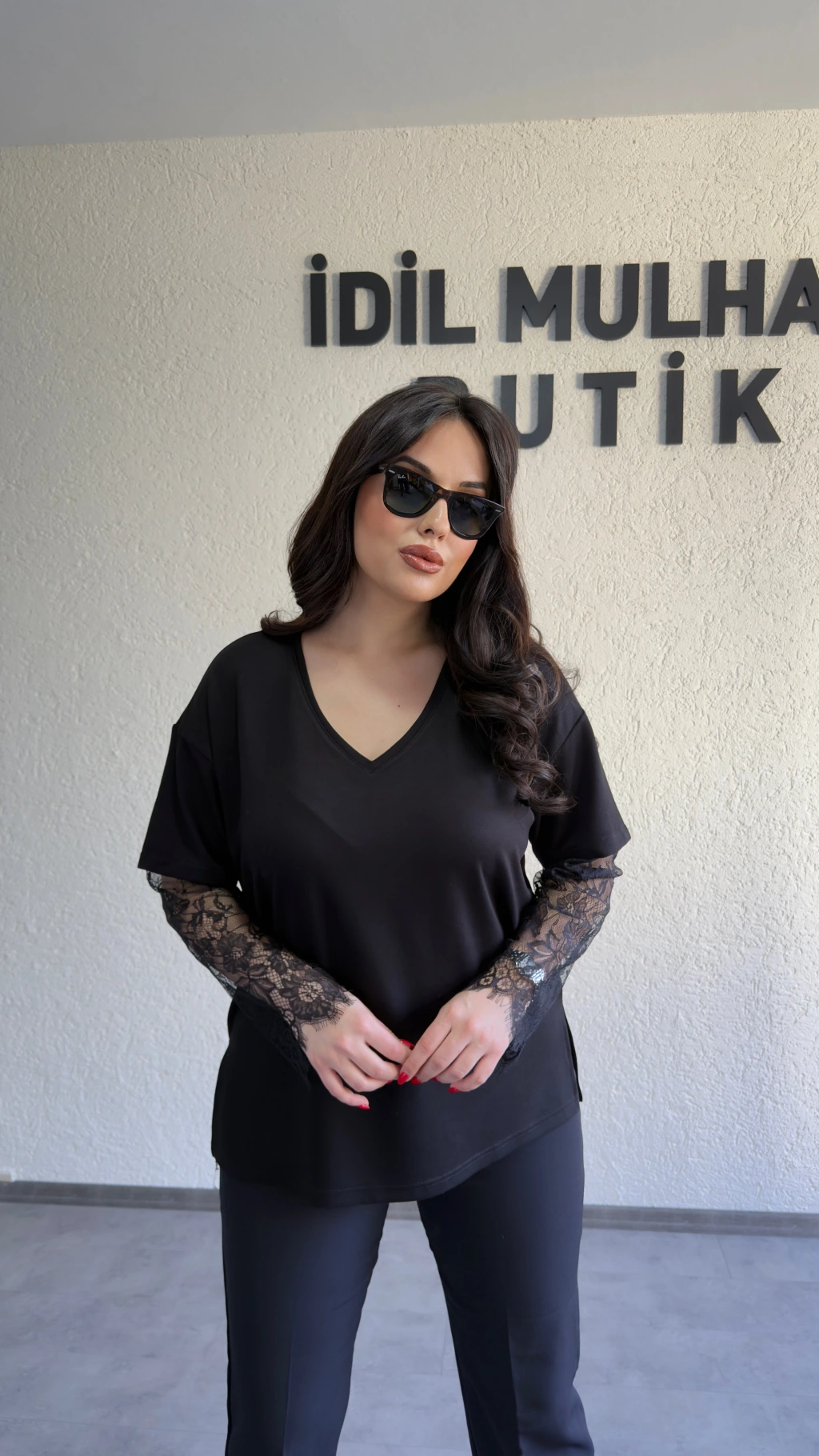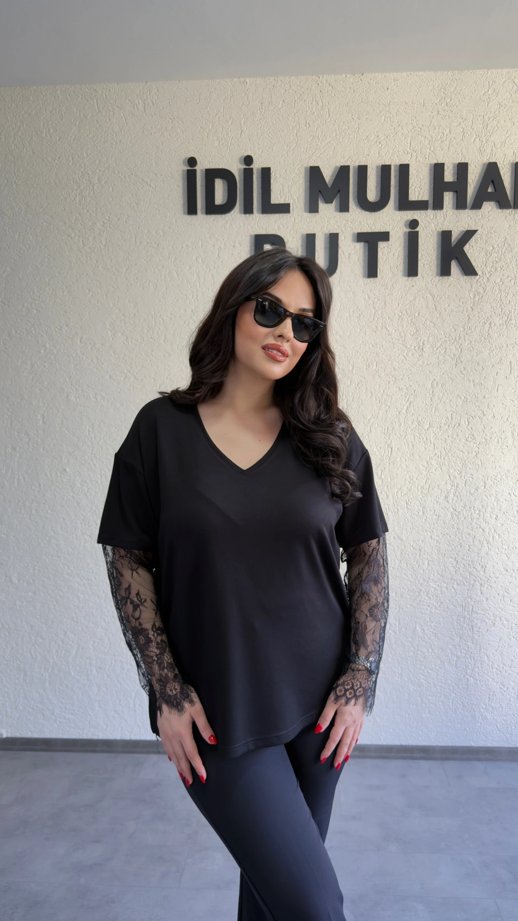 Siyah V Yaka Kolları Dantel Detaylı Tişört